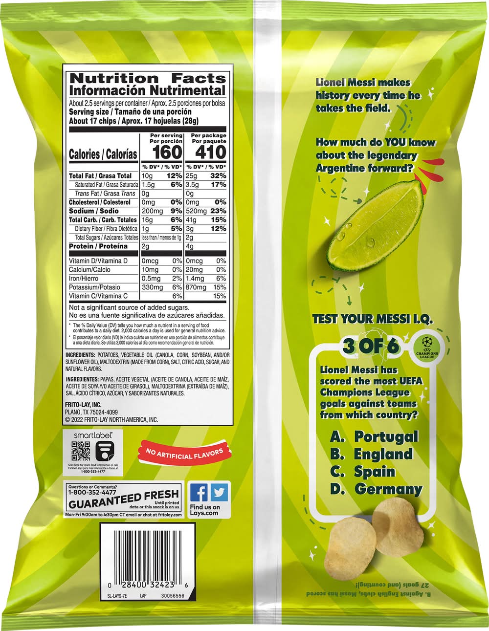 Farm-grown potatoes, cooked to perfection and seasoned with real zesty lime. • Brand: Lay's • Flavor: Limón