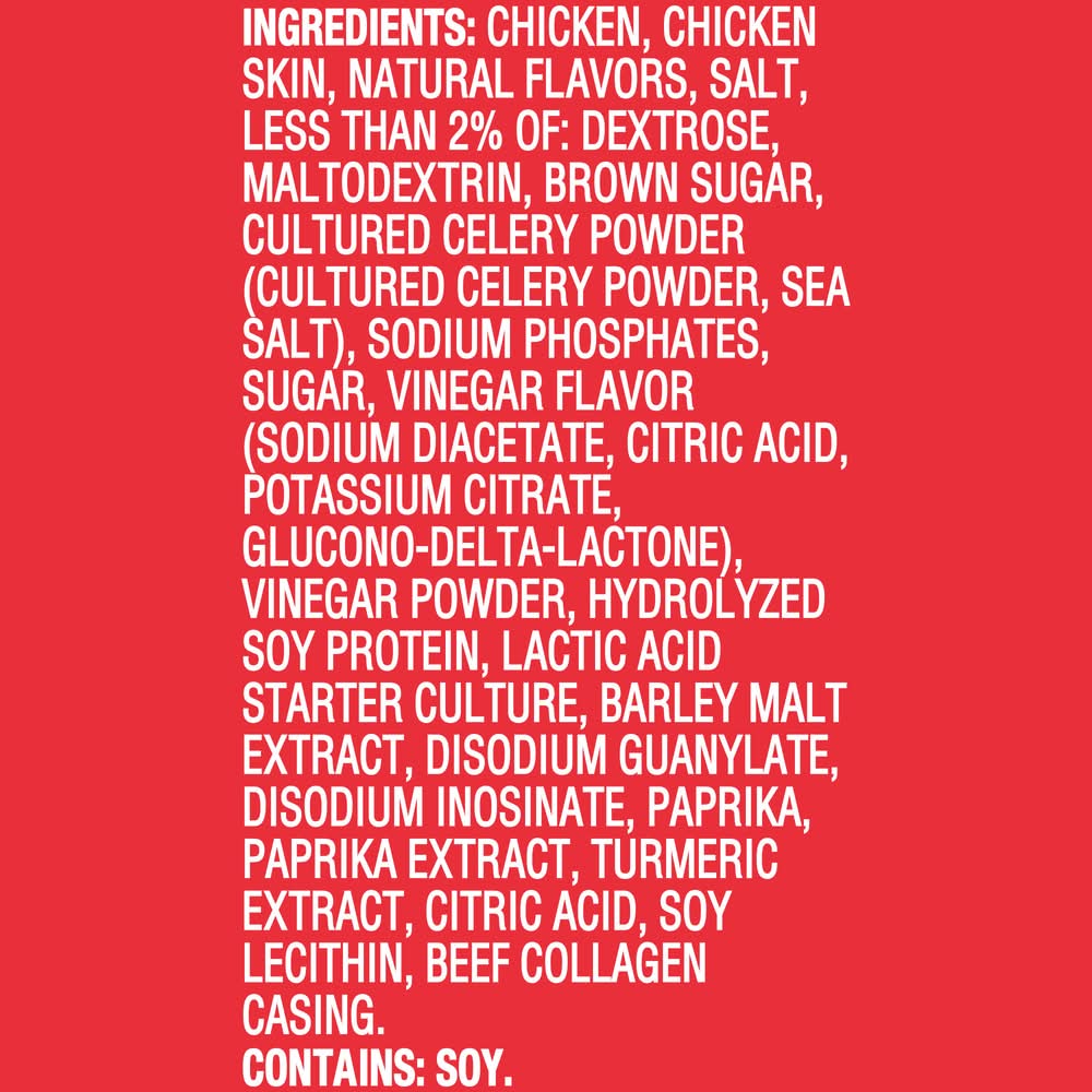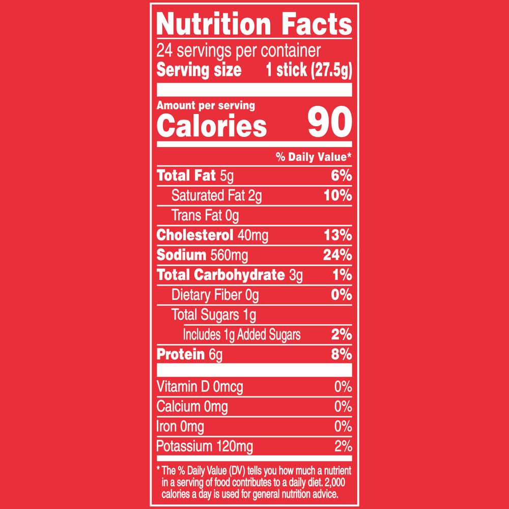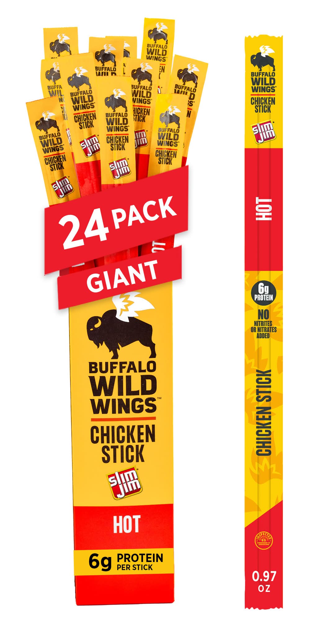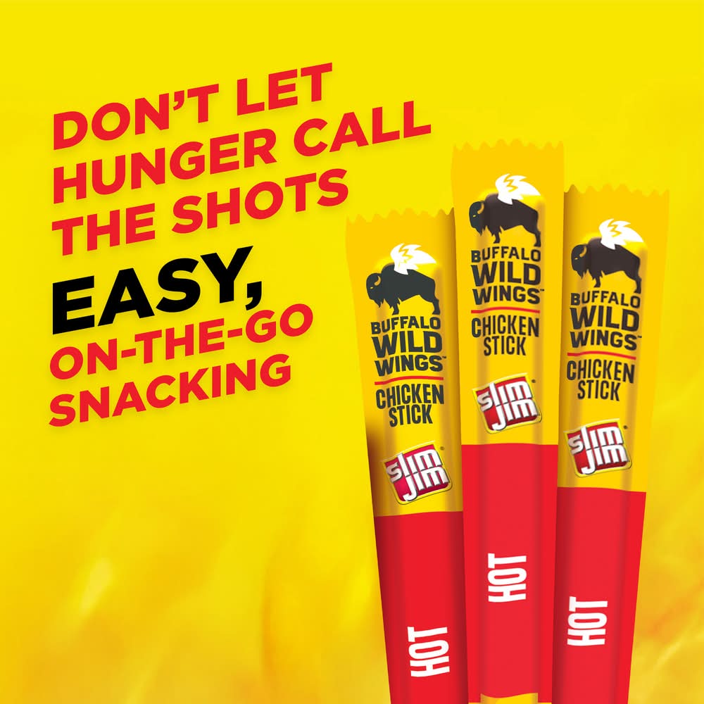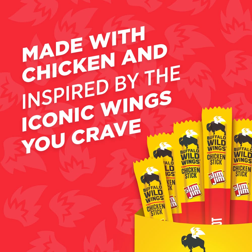 Turn up the heat and take the legendary flavor of Buffalo Wild Wings to-go with Buffalo Wild Wings Hot Chicken Sticks by Slim Jim. Made with chicken and inspired by the iconic wings you crave, this tender, juicy meat snack delivers the fiery, mouthwatering taste of Buffalo Wild Wings' signature hot wing sauce flavor in every bite. With 6 grams of protein per stick and no nitrites or nitrates added (except for those naturally occurring in celery powder and sea salt), each meat stick is individually wrapped for easy, on-the-go snacking. Perfect for camping snacks, lunch snacks or car snacks for the open road, this spicy meat stick brings the flavor of your favorite Buffalo Wild Wings sauce wherever you go. Don’t let hunger call the shots ... satisfy your cravings with Buffalo Wild Wings Chicken Sticks. • Brand: Slim jim • Flavor: Hot • Pack size: 24