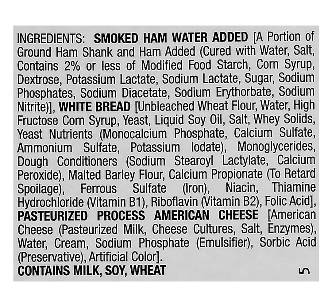Ingredients: Smoked Ham Water Added [a Portion of Ground Ham Shank and Ham Added (Cured with Water, Salt, Contains 2% or Less of Modified Food Starch, Corn Syrup, Dextrose, Potassium Lactate, Sodium Lactate, Sugar, Sodium Phosphates, Sodium Diacetate, Sodium Erythorbate, Sodium Nitrite)], White Bread [Unbleached Wheat Flour, Water, High Fructose Corn Syrup, Yeast, Liquid Soy Oil, Salt, Whey Solids, Yeast Nutrients (Monocalcium Phosphate, Calcium Sulfate, Ammonium Sulfate, Potassium Iodate), Monoglycerides, Dough Conditioners (Sodium Stearoyl Lactylate, Calcium Peroxide), Malted Barley Flour, Calcium Propionate (to Retard Spoilage), Ferrous Sulfate (Iron), Niacin, Thiamine Hydrochloride (Vitamin B1), Riboflavin (Vitamin B2), Folic Acid], Pasteurized Process American Cheese [American Cheese (Pasteurized Milk, Cheese Cultures, Salt, Enzymes), Water, Cream, Sodium Phosphate (Emulsifier), Sorbic Acid (Preservative), Artificial Color] Contains: Milk, Soybeans, Wheat