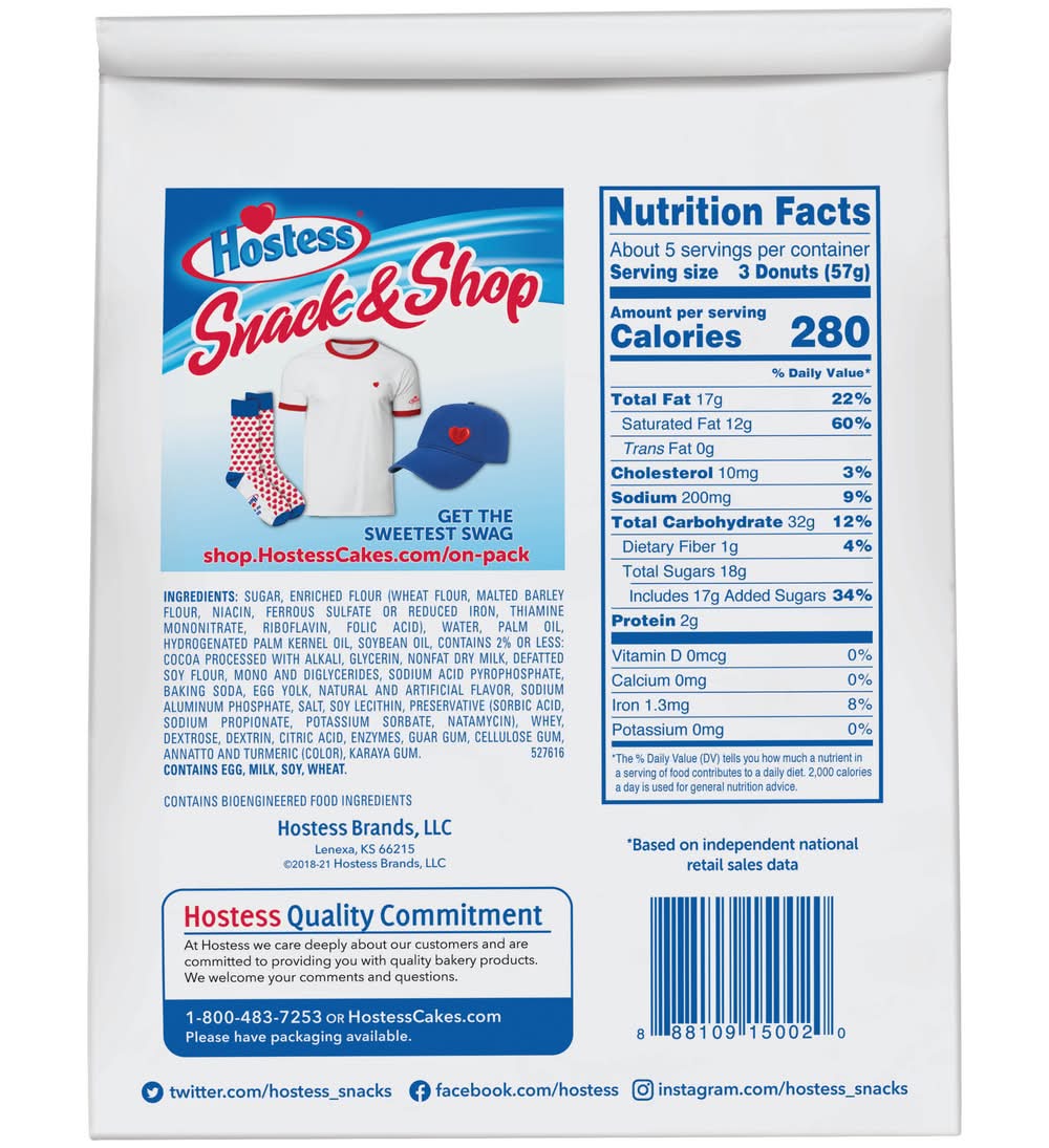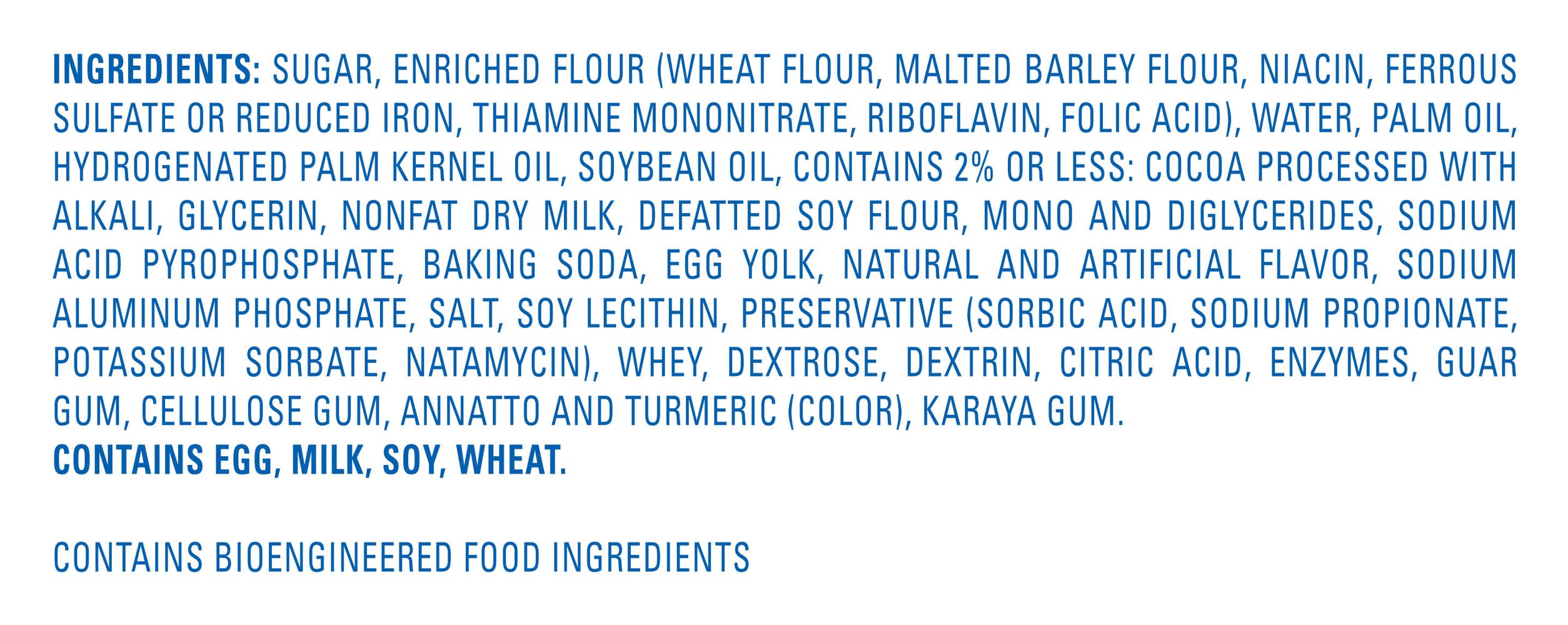 Ingredients: Sugar, Enriched Flour (Wheat Flour, Malted Barley Flour, Niacin, Ferrous Sulfate Or Reduced Iron, Thiamine Mononitrate, Riboflavin, Folic Acid), Water, Palm Oil, Hydrogenated Palm Kernel Oil, Soybean Oil, Contains 2% Or Less: Cocoa Processed With Alkali, Glycerin, Nonfat Dry Milk, Defatted Soy Flour, Mono And Diglycerides, Natural And Artificial Flavor, Sodium Acid Pyrophosphate, Baking Soda, Egg Yolk, Sodium Aluminum Phosphate, Salt, Soy Lecithin, Preservative (Sorbic Acid, Sodium Propionate, Potassium Sorbate, Natamycin), Whey, Dextrose, Dextrin, Citric Acid, Enzymes, Guar Gum, Cellulose Gum, Annatto And Turmeric (Color), Karaya Gum. Contains Egg, Milk, Soy, Wheat. Contains Bioengineered Food Ingredients. Contains: Contains Egg, Milk, Soy, Wheat. Contains Bioengineered Food Ingredients.