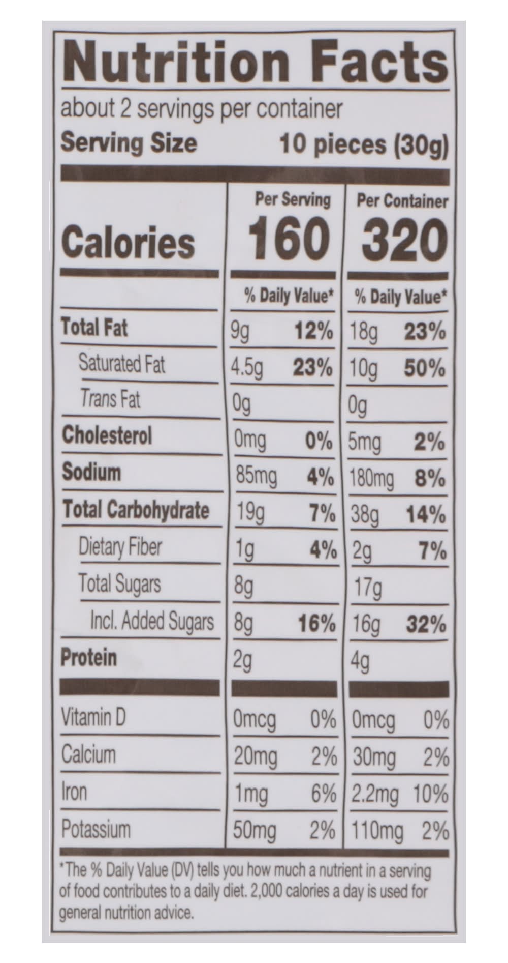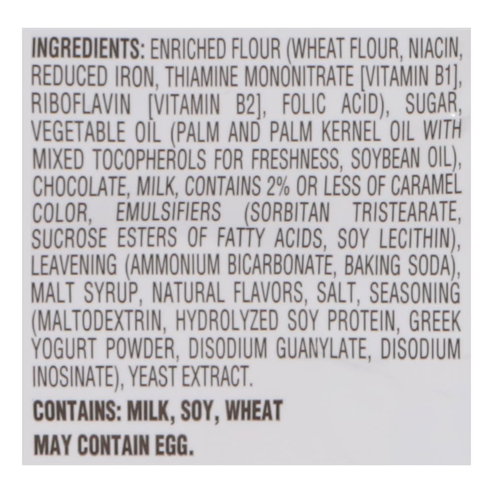 Ingredients: Enriched Flour (Wheat Flour, Niacin, Reduced Iron, Thiamine Mononitrate [Vitamin B1], Riboflavin [Vitamin B2], Folic Acid), Sugar, Vegetable Oil (Palm and Palm Kernel Oil with Mixed Tocopherols for Freshness, Soybean Oil), Chocolate, Milk, Contains 2% or Less of Caramel Color, Emulsifiers (Sorbitan Tristearate, Sucrose Esters of Fatty Acids, Soy Lecithin), Leavening (Ammonium Bicarbonate, Baking Soda), Malt Syrup, Natural Flavors, Salt, Seasoning (Maltodextrin, Hydrolyzed Soy Protein, Greek Yogurt Powder, Disodium Guanylate, Disodium, Inosinate), Yeast Extract Contains: Milk, Soybeans, Wheat, Eggs