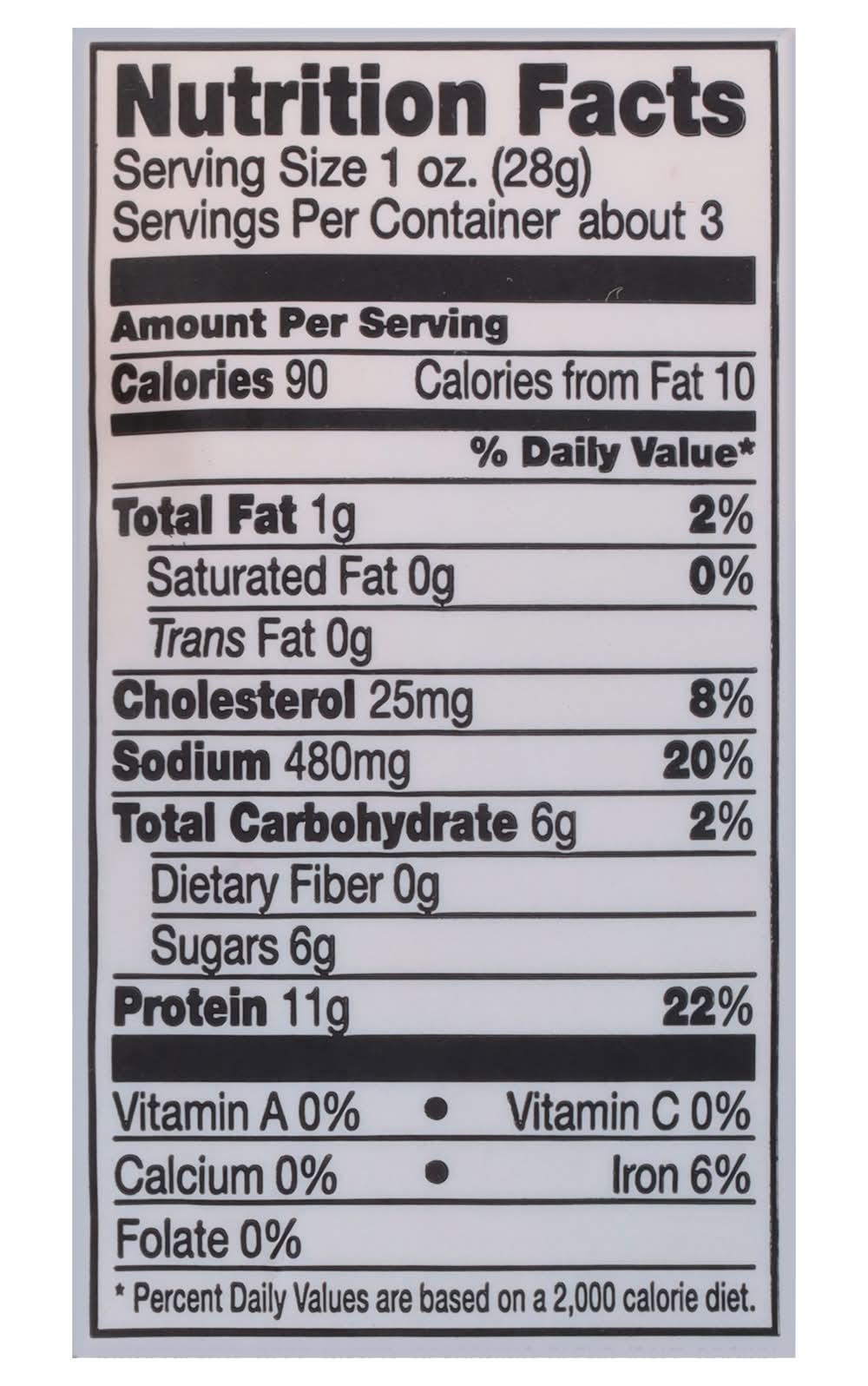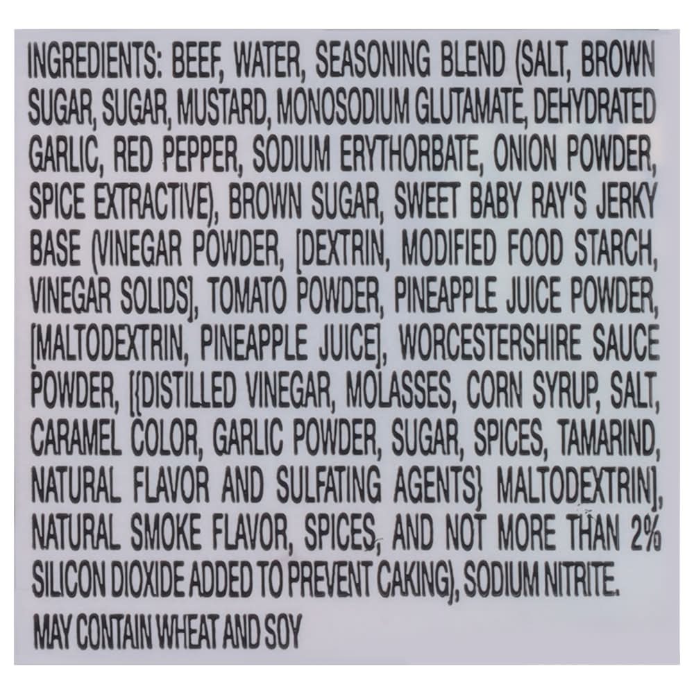 Ingredients: Beef, Water, Seasoning Blend (Salt, Brown Sugar, Sugar, Mustard, Monosodium Glutamate, Dehydrated Garlic, Red Pepper, Sodium Erythorbate, Onion Powder, Spice Extractive), Brown Sugar, Sweet Baby Ray's Jerky Base (Vinegar Powder, [Dextrin, Modified Food Starch, Vinegar Solids], Tomato Powder, Pineapple Juice Powder, [Maltodextrin, Pineapple Juice], Worcestershire Sauce Powder, [{Distilled Vinegar, Molasses, Corn Syrup, Salt, Caramel Color, Garlic Powder, Sugar, Spices, Tamarind, Natural Flavor and Sulfating Agents} Maltodextrin], Natural Smoke Flavor, Spices, and Not More than 2% Silicon Dioxide Added to Prevent Caking), Sodium Nitrite Contains: Wheat, Soybeans