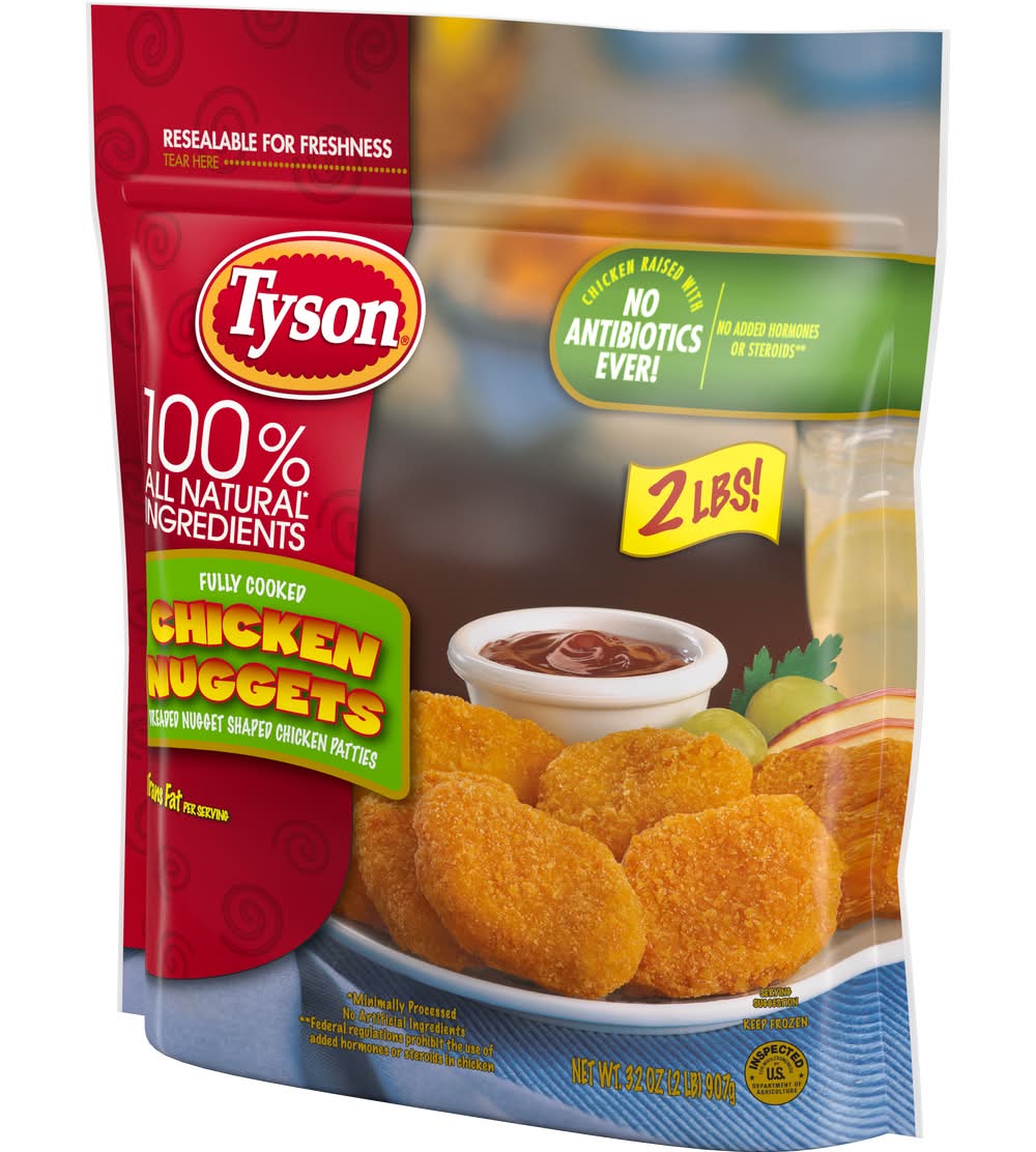 Crispy fully cooked chicken nuggets with 100% all natural ingredients. • Brand: Tyson • Flavor: Chicken