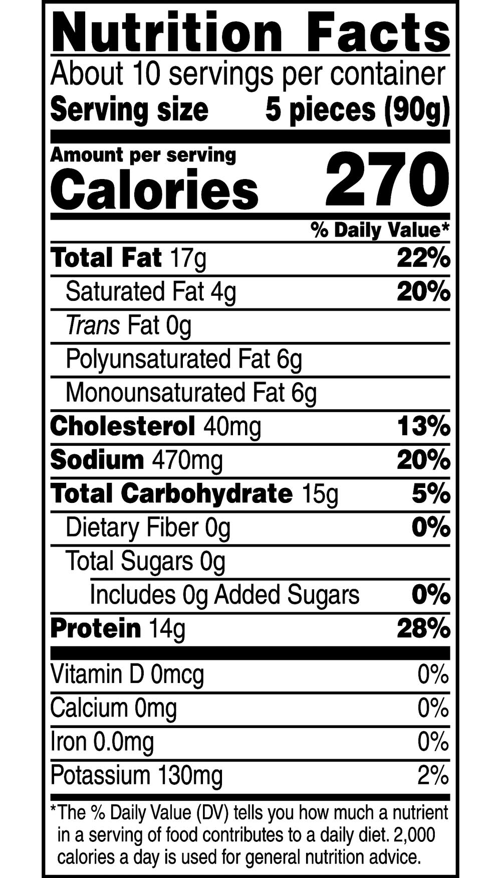 Ingredients: Chicken, water, wheat flour, contains 2% or less of the following: brown sugar, corn starch, dried garlic, dried onion, dried yeast, extractives of paprika, natural flavor, oat fiber, salt, spices, wheat starch, white whole wheat flour, yellow corn flour. Breading set in vegetable oil. Contains: Wheat