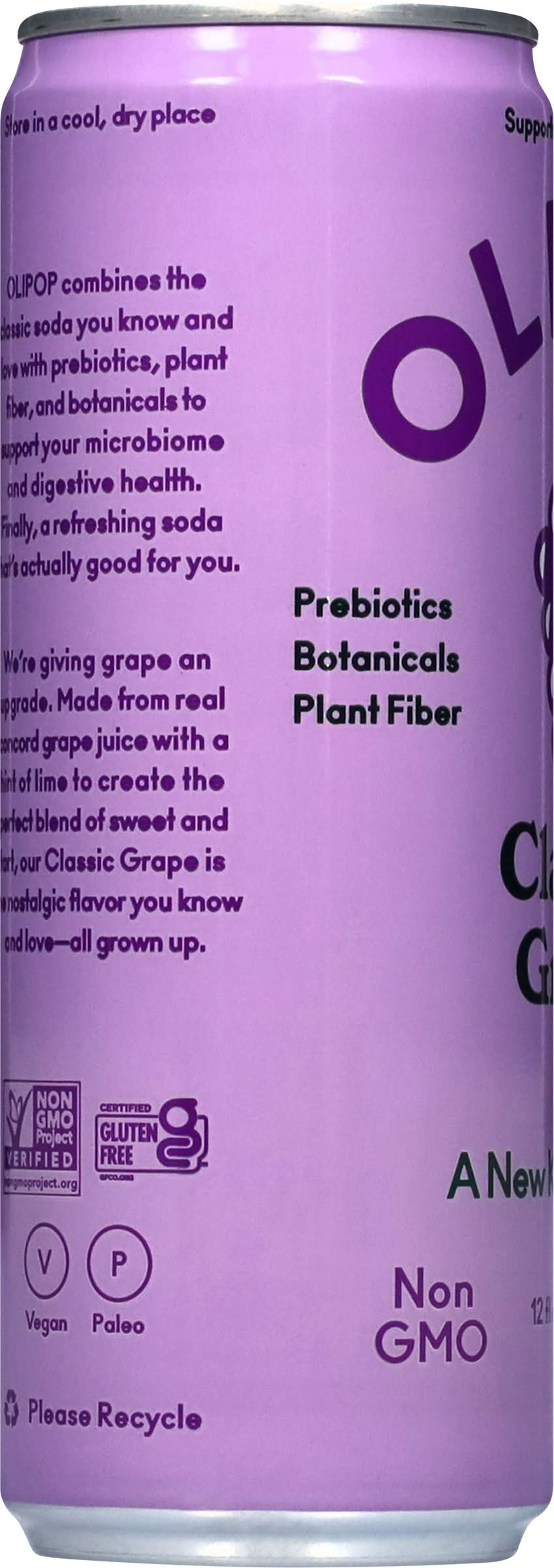 Soda, Classic Grape • Brand: Olipop • Flavor: Classic grape • gluten-free, vegan, GMO-free • Packaging: Reusable