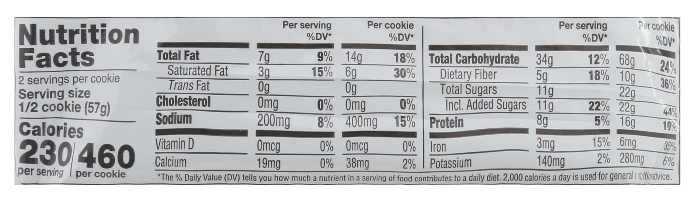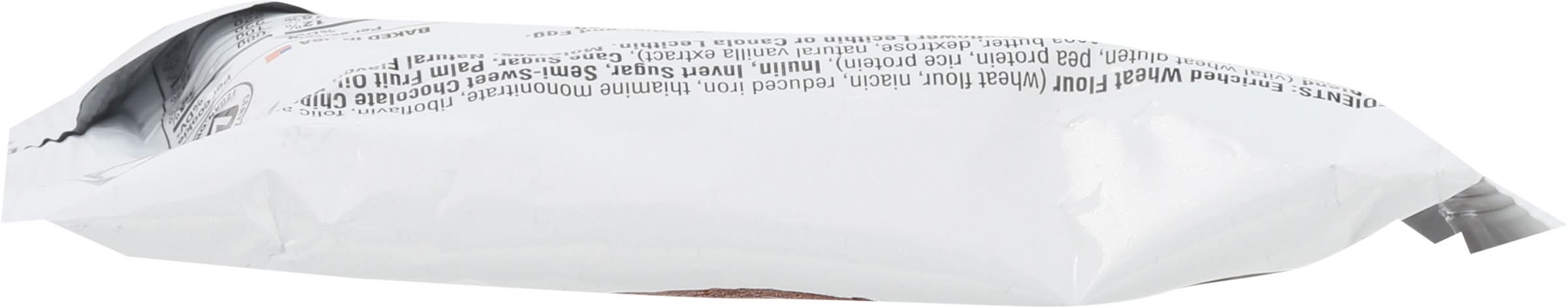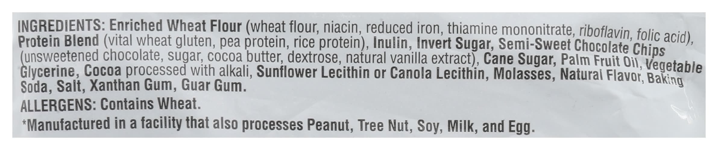 Ingredients: Enriched Wheat Flour (Wheat Flour, Niacin, Reduced Iron, Thiamine Mononitrate, Riboflavin, Folic Acid), Protein Blend (Vital Wheat Gluten, Pea Protein, Rice Protein), Inulin, Invert Sugar, Semi-Sweet Chocolate Chips (Unsweetened Chocolate, Sugar, Cocoa Butter, Dextrose, Natural Vanilla Extract), Cane Sugar, Palm Fruit Oil, Vegetable Glycerine, Cocoa Processed with Alkali, Sunflower Lecithin or Canola Lecithin, Molasses, Natural Flavor, Baking Soda, Salt, Xanthan Gum, Guar Gum Contains: Wheat, Gluten, Peanuts, Tree Nuts, Milk, Eggs, Soybeans