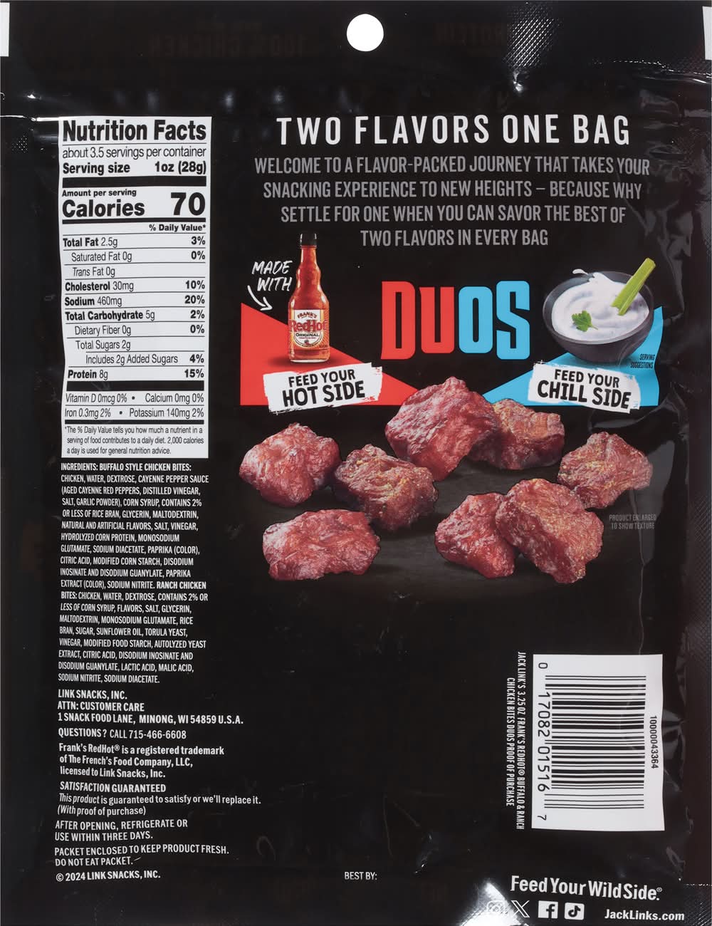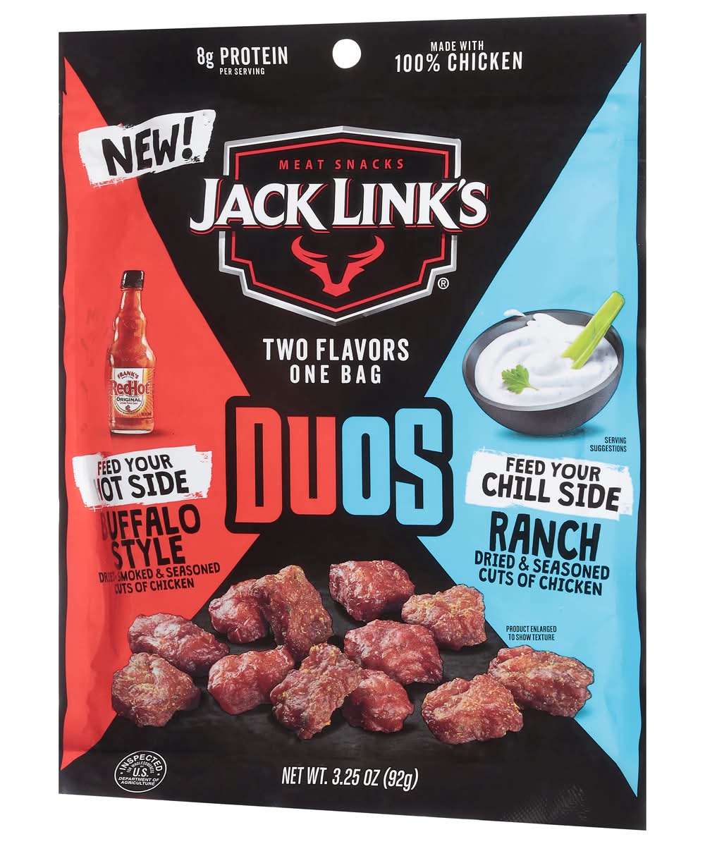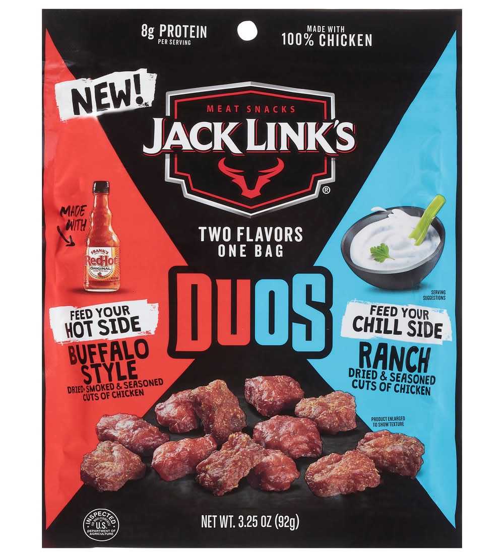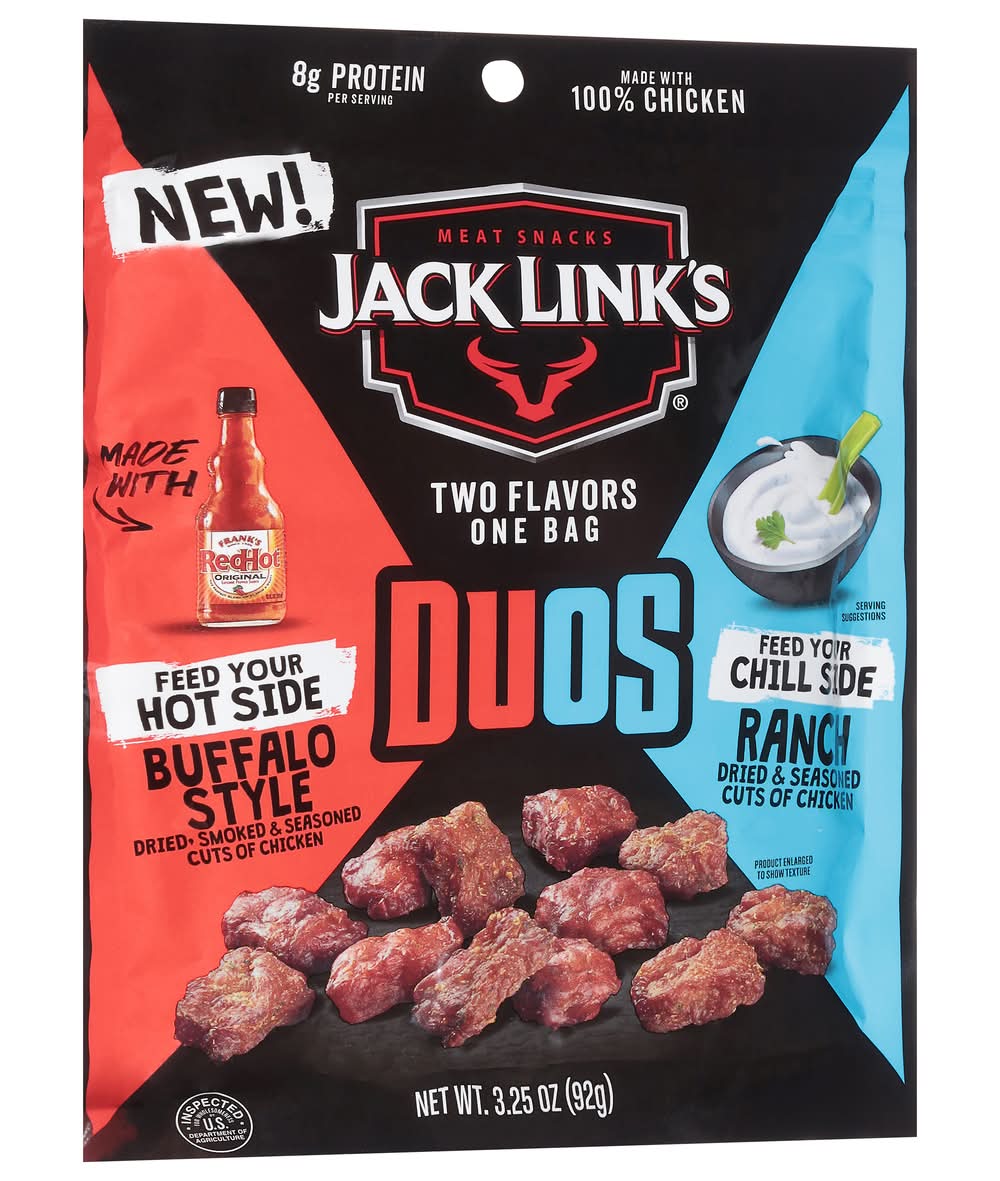 Take your snack game to new heights with Jack Link's® Buffalo Style and Rancho Duo Chicken Bites. Turn up the heat with dried, smoked cuts of buffalo-style chicken, and then chill out with dried cuts of ranch-seasoned chicken – or enjoy 'em together for an entirely new experience! • Brand: Jack link's • Flavor: Buffalo style-ranch