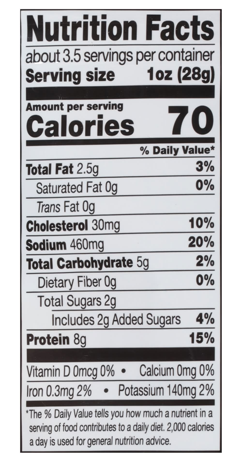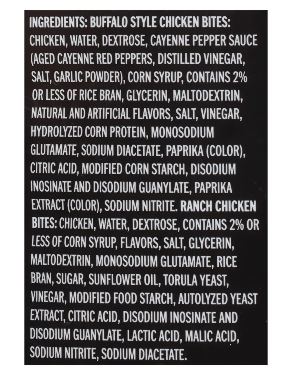 Ingredients: Buffalo Style Chicken Bites: Chicken, Water, Dextrose, Cayenne Pepper Sauce (Aged Cayenne Red Peppers, Distilled Vinegar, Salt, Garlic Powder), Corn Syrup, Contains 2% or Less of Rice Bran, Glycerin, Maltodextrin, Natural and Artificial Flavors, Salt, Vinegar, Hydrolyzed Corn Protein, Monosodium Glutamate, Sodium Diacetate, Paprika (Color), Citric Acid, Modified Corn Starch, Disodium Inosinate and Disodium Guanylate, Paprika Extract (Color), Sodium Nitrite, Ranch Chicken Bites: Chicken, Water, Dextrose, Contains 2% or Less of Corn Syrup, Flavors, Salt, Glycerin, Maltodextrin, Monosodium Glutamate, Rice Bran, Sugar, Sunflower Oil, Torula Yeast, Vinegar, Modified Food Starch, Autolyzed Yeast Extract, Citric Acid, Disodium Inosinate and Disodium Guanylate, Lactic Acid, Malic Acid, Sodium Nitrite, Sodium Diacetate