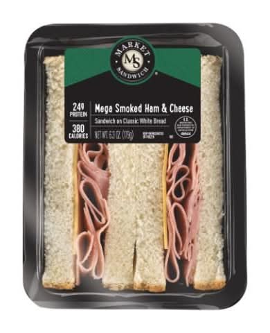 Mega Smoked Ham & Cheese wedge sandwich is true Americana, and a lot of it. Now enjoy more slices of hardwood smoked ham layered with classic American cheese on fresh white bread to satisfy your hunger. Brand: Market sandwich