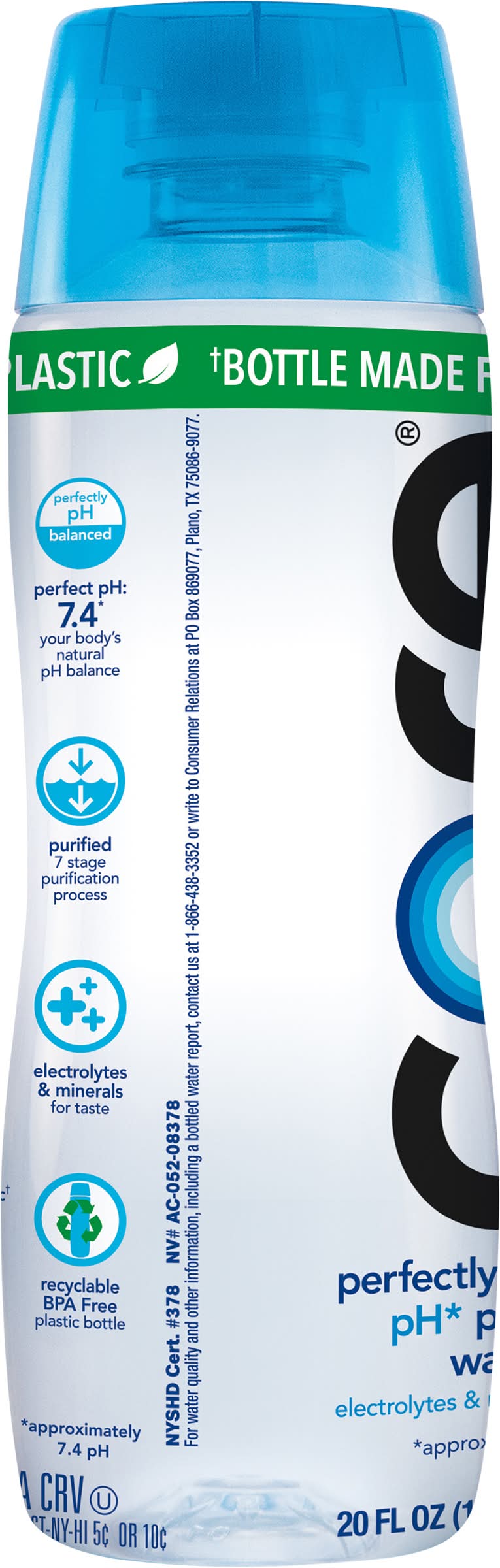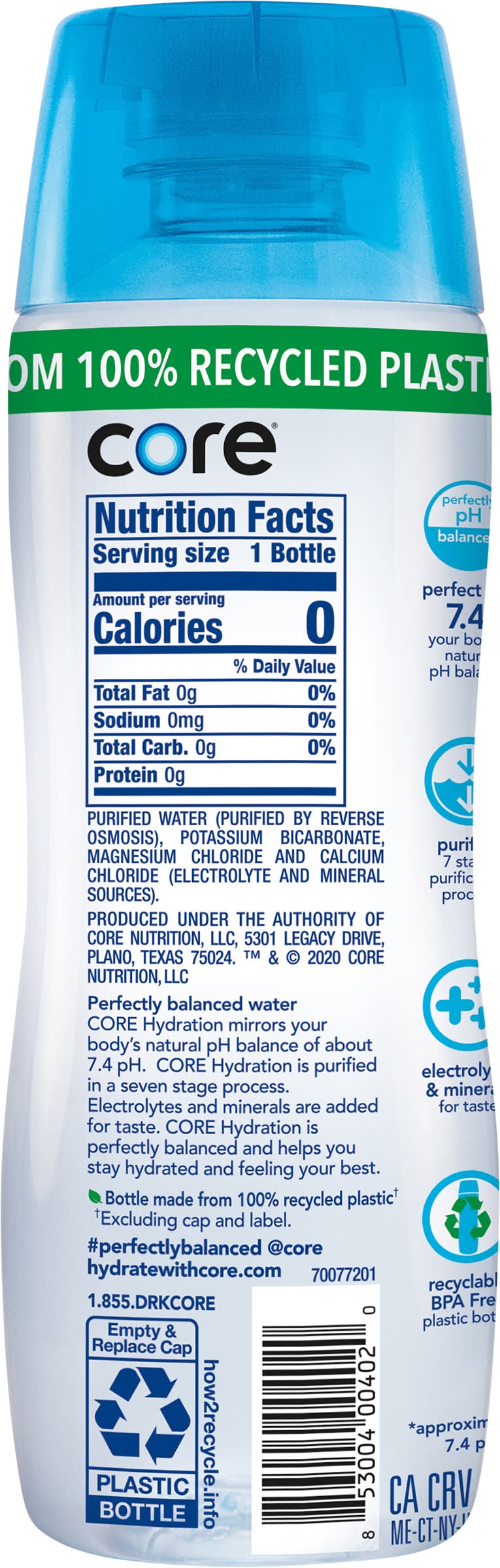 Electrolytes & minerals for taste. Perfect ph. 7.4 (approximately 7. 4) your body's natural ph. balance. Purified 7 stage purification process. Mirrors your body's natural ph. balance of about 7. 4 ph. And helps you stay hydrated and feeling your best. • Brand: Core hydration • Core Nutrition LLC, 5301 Legacy Drive,Plano,TX,75024 • Packaging: Reusable
