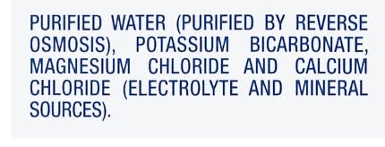 Ingredients: Purified Water (Purified by Reverse Osmosis Potassium Bicarbonate Magnesium Chloride and Calcium Chloride (Electrolyte & Mineral Sources)