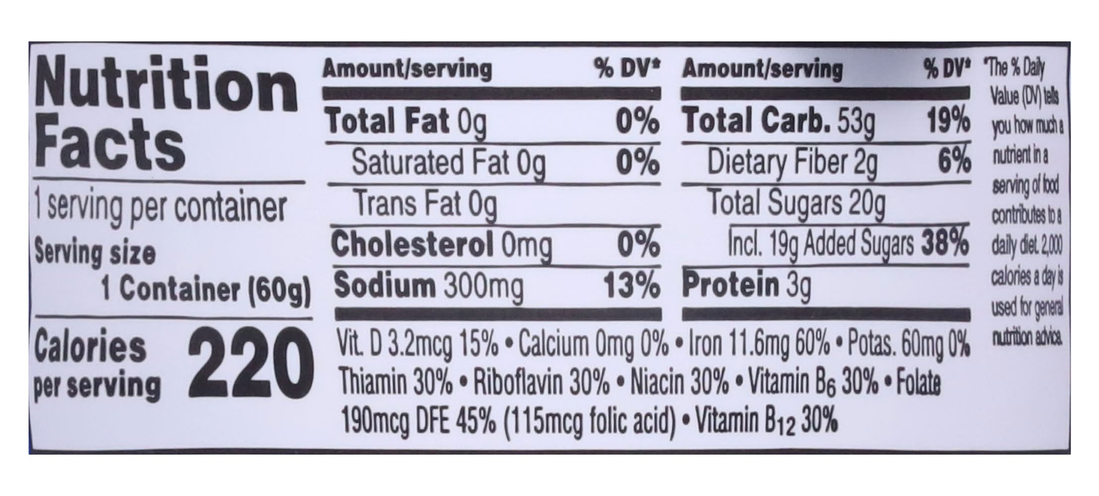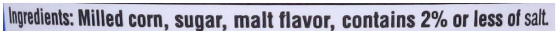 Ingredients: Milled Corn, Sugar, Malt Flavor, Contains 2% or Less of Salt. Vitamins and Minerals: Iron (Ferric Phosphate), Niacinamide, Vitamin B6 (Pyridoxine Hydrochloride), Vitamin B2 (Riboflavin), Vitamin B1 (Thiamin Hydrochloride), Folic Acid, Vitamin D3, Vitamin B12