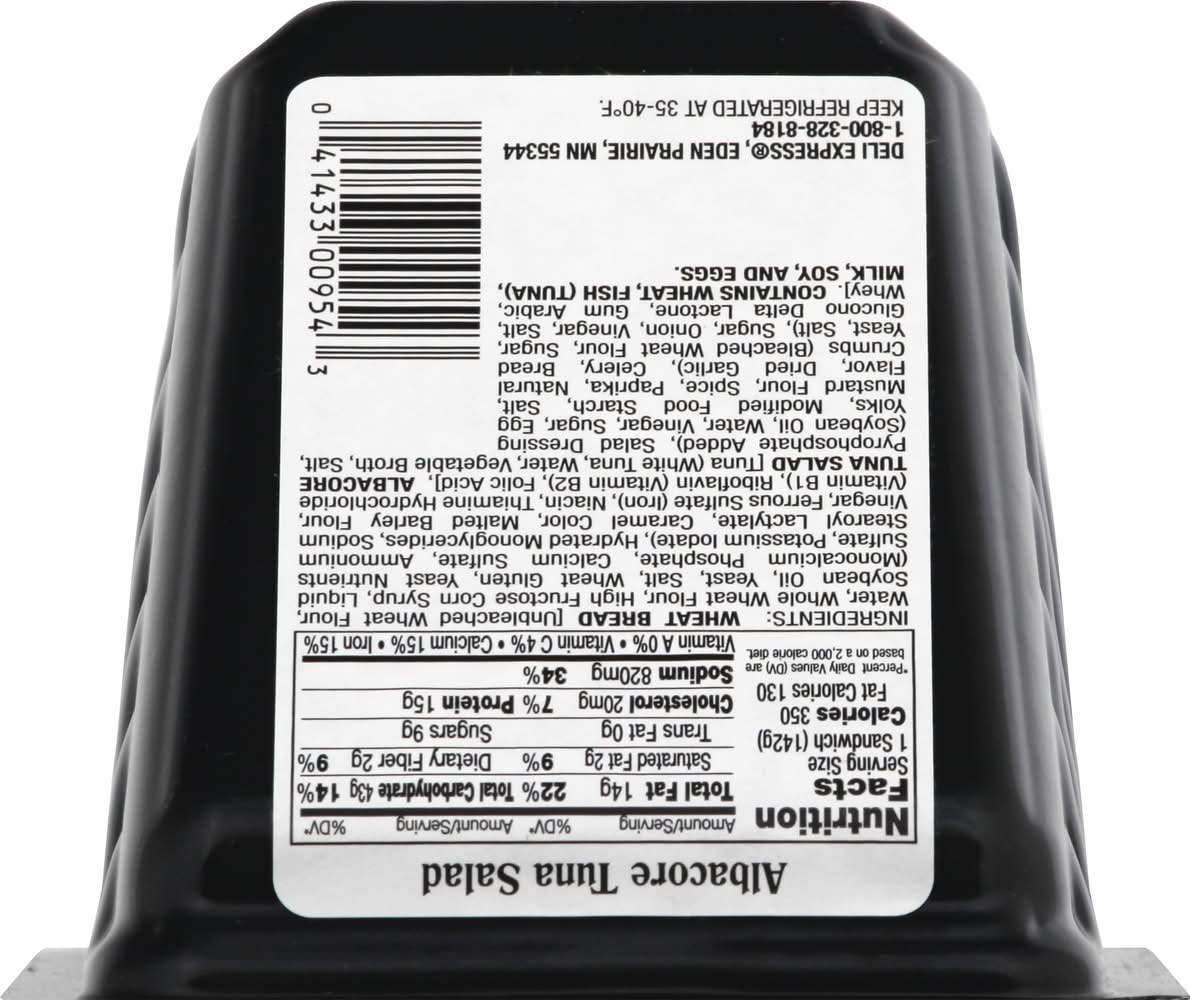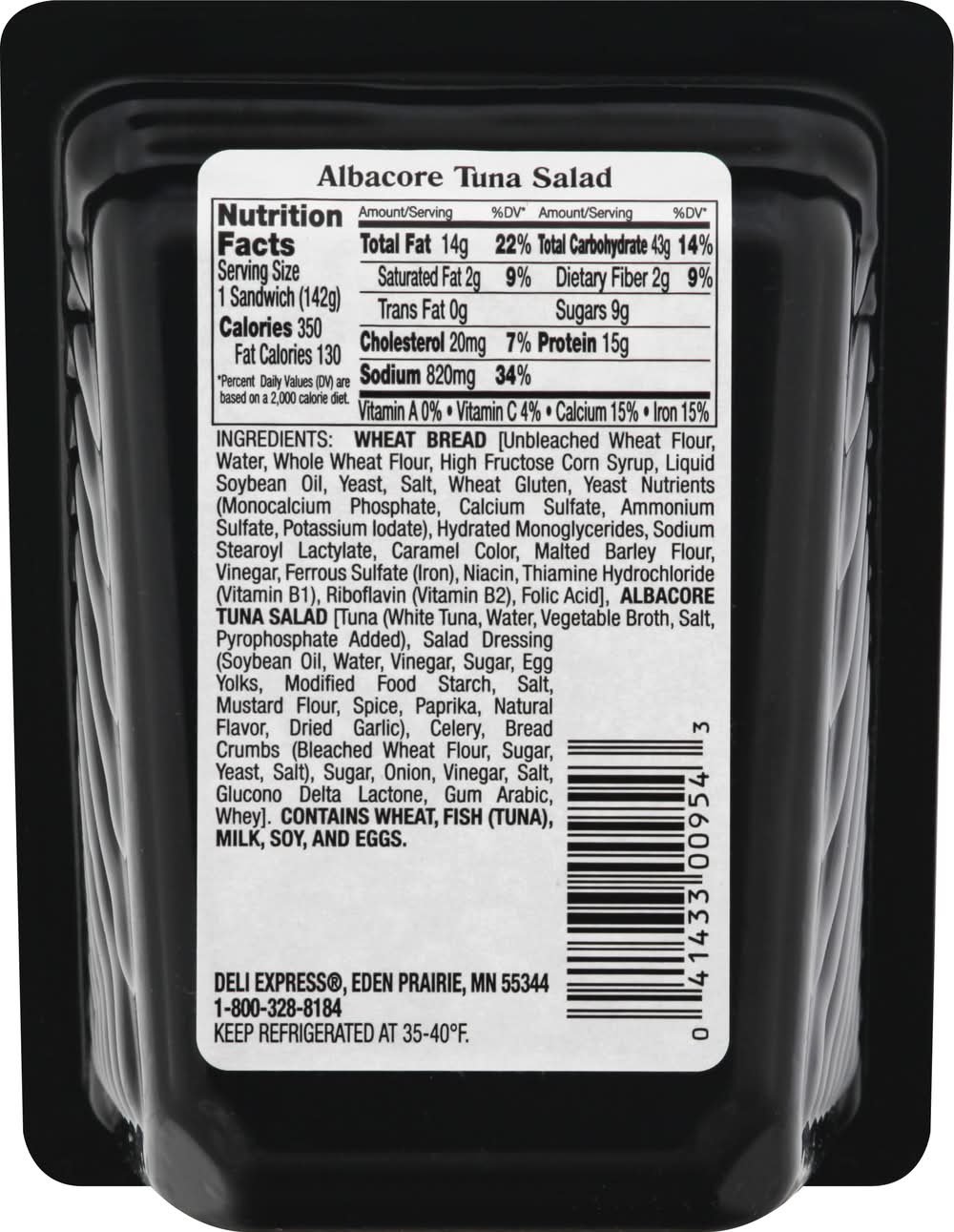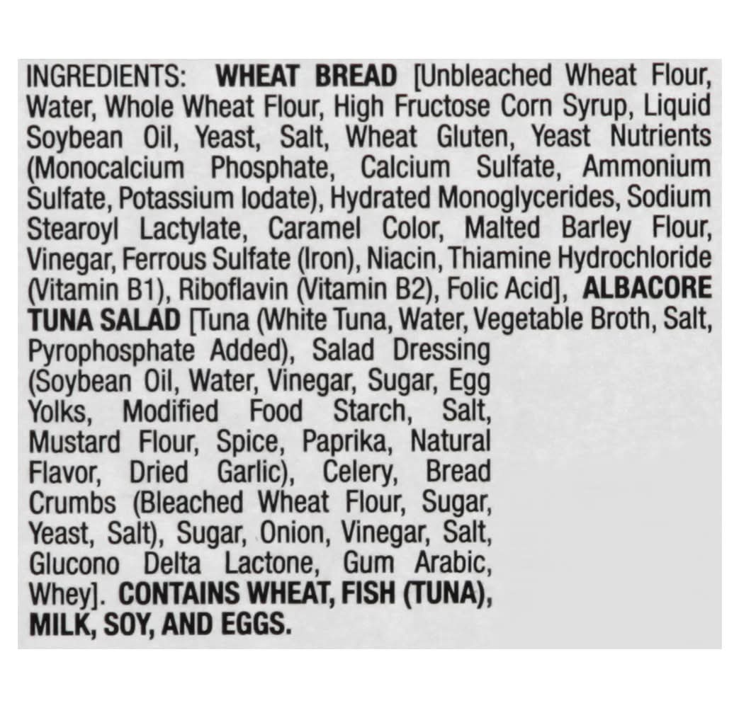 Ingredients: Wheat Bread [Unbleached Wheat Flour, Water, Whole Wheat Flour, High Fructose Corn Syrup, Liquid Soybean Oil, Yeast, Salt, Wheat Gluten, Yeast Nutrients (Monocalcium Phosphate, Calcium Sulfate, Ammonium Sulfate, Potassium Iodate), Hydrated Monoglycerides, Sodium Stearoyl Lactylate, Caramel Color, Malted Barley Flour, Vinegar, Ferrous Sulfate (Iron), Niacin, Thiamine Hydrochloride (Vitamin B1), Riboflavin (Vitamin B2), Folic Acid], Albacore Tuna Salad [Tuna (White Tuna, Water, Vegetable Broth, Salt, Pyrophosphate Added), Salad Dressing (Soybean Oil, Water, Vinegar, Sugar, Egg Yolks, Modified Food Starch, Salt, Mustard Flour, Spice, Paprika, Natural Flavor, Dried Garlic), Celery, Bread Crumbs (Bleached Wheat Flour, Sugar, Yeast, Salt), Sugar, Onion, Vinegar, Salt, Glucono Delta Lactone, Gum Arabic, Whey] Contains: Wheat, Fish, Milk, Soybeans, Eggs