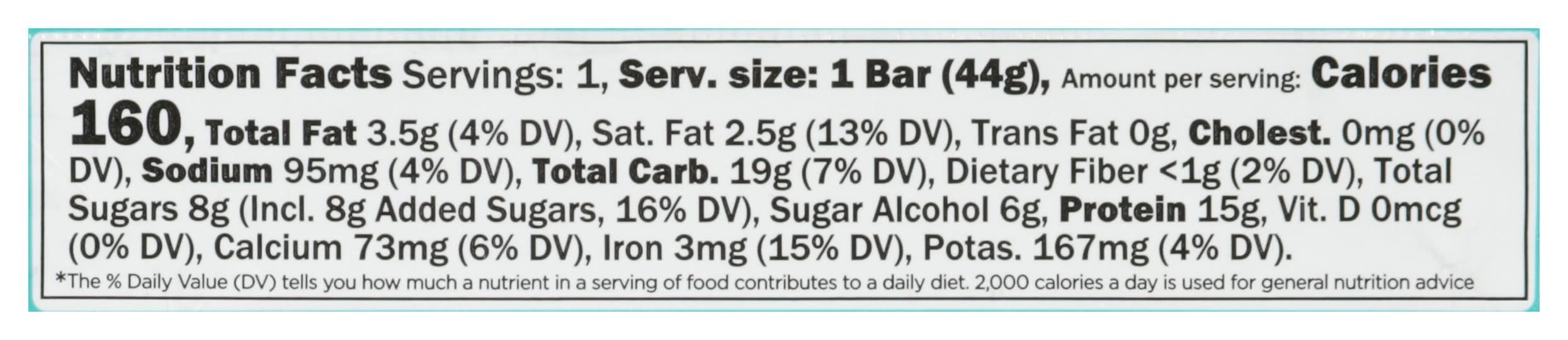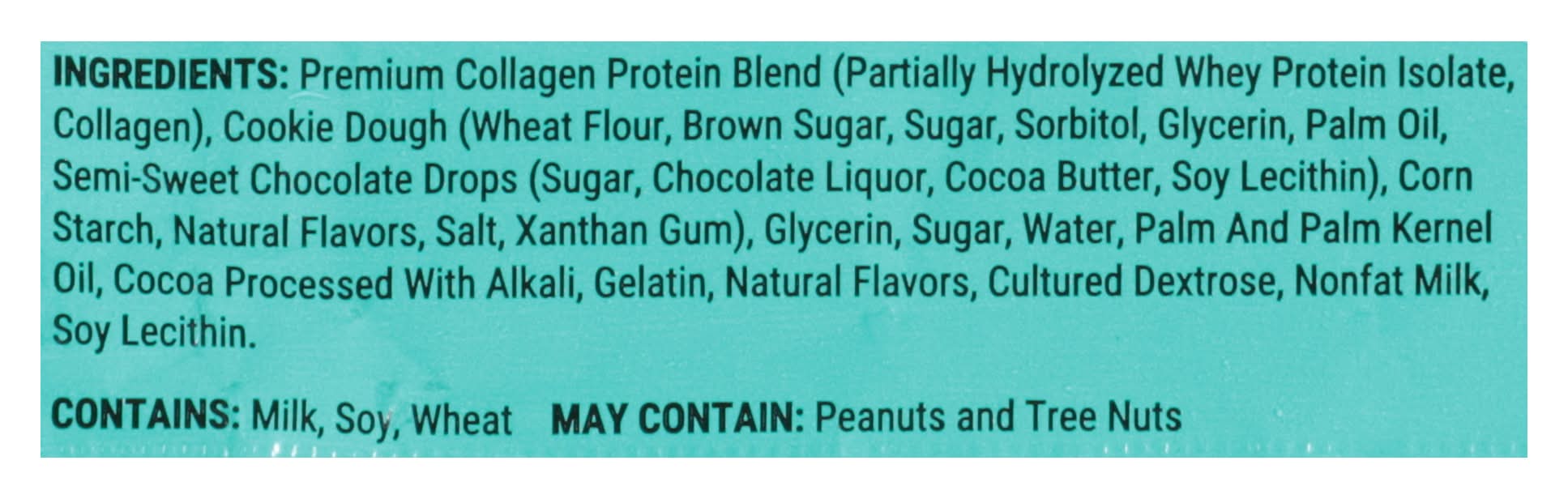 Ingredients: Premium Collagen Protein Blend (Partially Hydrolyzed Whey Protein Isolate, Collagen), Cookie Dough (Wheat Flour, Brown Sugar, Sugar, Sorbitol, Glycerin, Palm Oil, Semi-Sweet Chocolate Drops (Sugar, Chocolate Liquor, Cocoa Butter, Soy Lecithin), Corn Starch, Natural Flavors, Salt, Xanthan Gum), Glycerin, Sugar, Water, Palm and Palm Kernel Oil, Cocoa Processed with Alkali, Gelatin, Natural Flavors, Cultured Dextrose, Nonfat Milk, Soy Lecithin Contains: Milk, Soybeans, Wheat, Peanuts, Tree Nuts