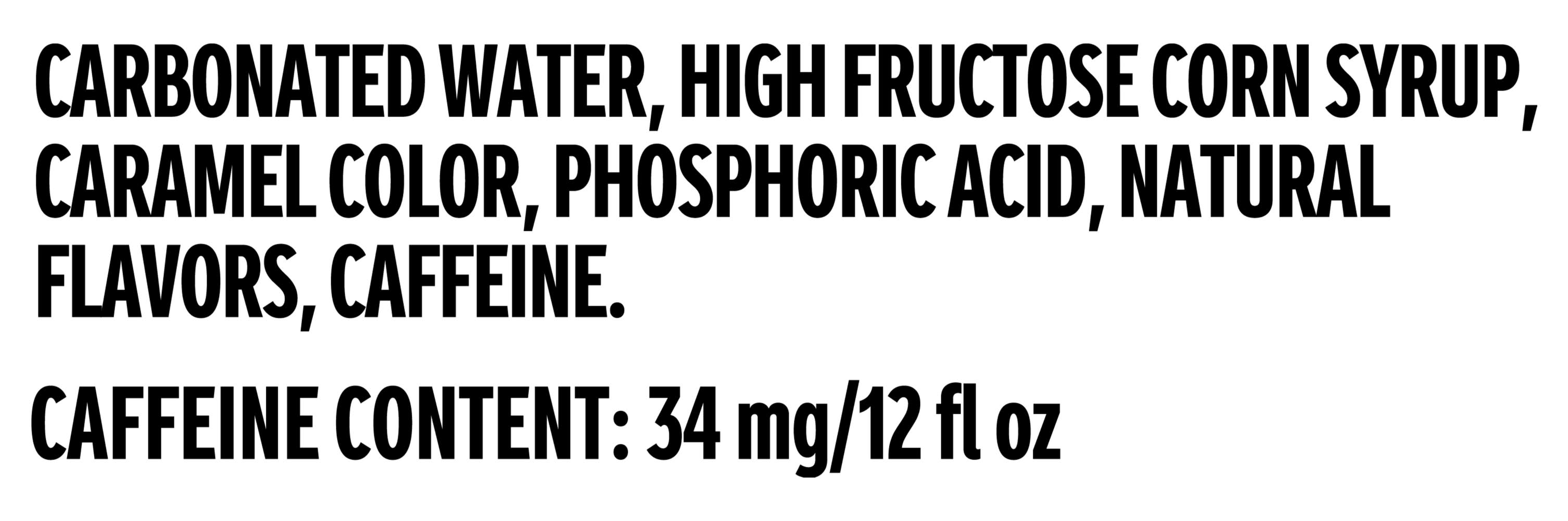 Ingredients: Carbonated Water, High Fructose Corn Syrup, Caramel Color, Phosphoric Acid, Natural Flavors, Caffeine. Contains: Corn