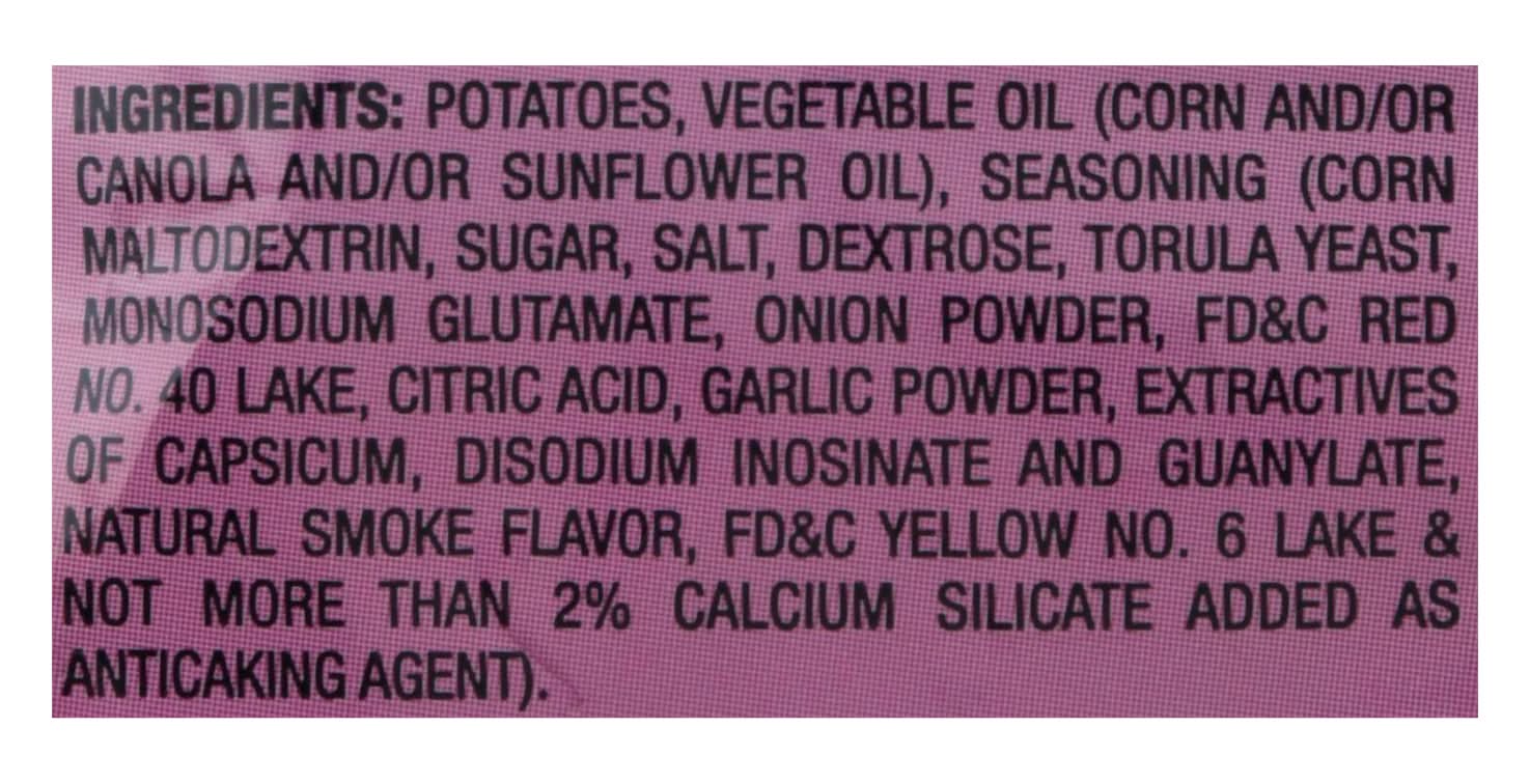 Ingredients: Potatoes, Vegetable Oil (Corn and/or Canola and/or Sunflower Oil), Seasoning (Corn Maltodextrin, Sugar, Salt, Dextrose, Torula Yeast, Monosodium Glutamate, Onion Powder, FD&C Red No.40 Lake, Citric Acid, Garlic Powder, Extractives of Capsicum, Disodium Inosinate and Guanylate, Natural Smoke Flavor, FD&C No.6 Lake & Not More than 2% Calcium Silicate Added as Anticaking Agents)