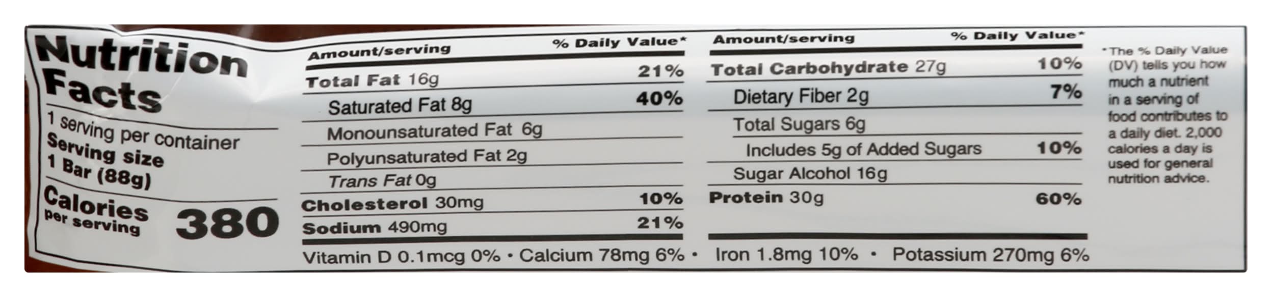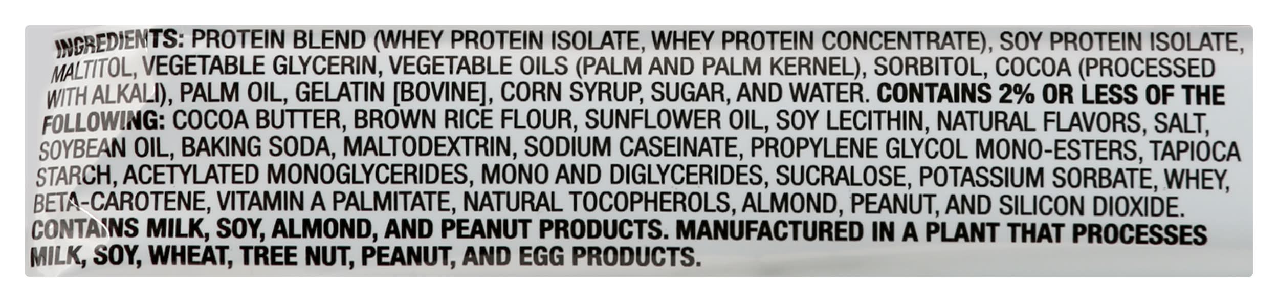 Ingredients: Protein Blend (Whey Protein Isolate, Whey Protein Concentrate), Soy Protein Isolate, Maltitol, Vegetable Glycerin, Vegetable Oils (Palm and Palm Kernel), Sorbitol, Cocoa (Processed with Alkali), Palm Oil, Gelatin [Bovine], Corn Syrup, Sugar, and Water. Contains 2% of Less of the Following: Cocoa Butter, Brown Rice Flour, Sunflower Oil, Soy Lecithin, Natural Flavors, Salt, Soybean Oil, Baking Soda, Maltodextrin, Sodium Caseinate, Propylene Glycol Mono-Esters, Tapioca Starch, Acetylated Monoglycerides, Mono and Diglycerides, Sucralose, Potassium Sorbate, Whey, Beta-Carotene, Vitamin A Palmitate, Natural Tocopherols, Almond, Peanut, and Silicon Dioxide Contains: Milk, Soybeans, Tree Nuts, Peanuts, Milk, Soybeans, Wheat, Tree Nuts, Peanuts, Eggs