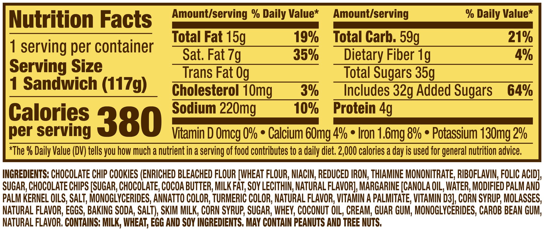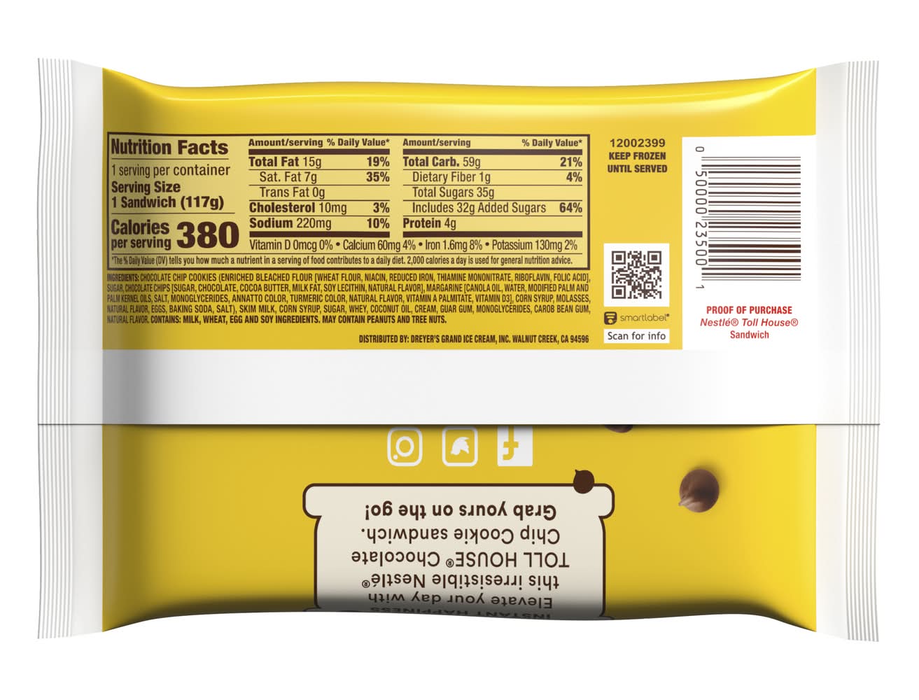 Indulge in a Cookie Sandwich, where your favorite morsels are nestled between two chocolate chip cookies. This frozen dairy dessert sandwich offers a delightful blend of flavors with no artificial flavors or colors, incorporating added colors from natural sources. Each sandwich contains 380 calories and provides detailed nutritional information regarding total fat and saturated fat content. • Brand: Toll house • Flavor: Chocolate chip • kosher • Number of servings: 1