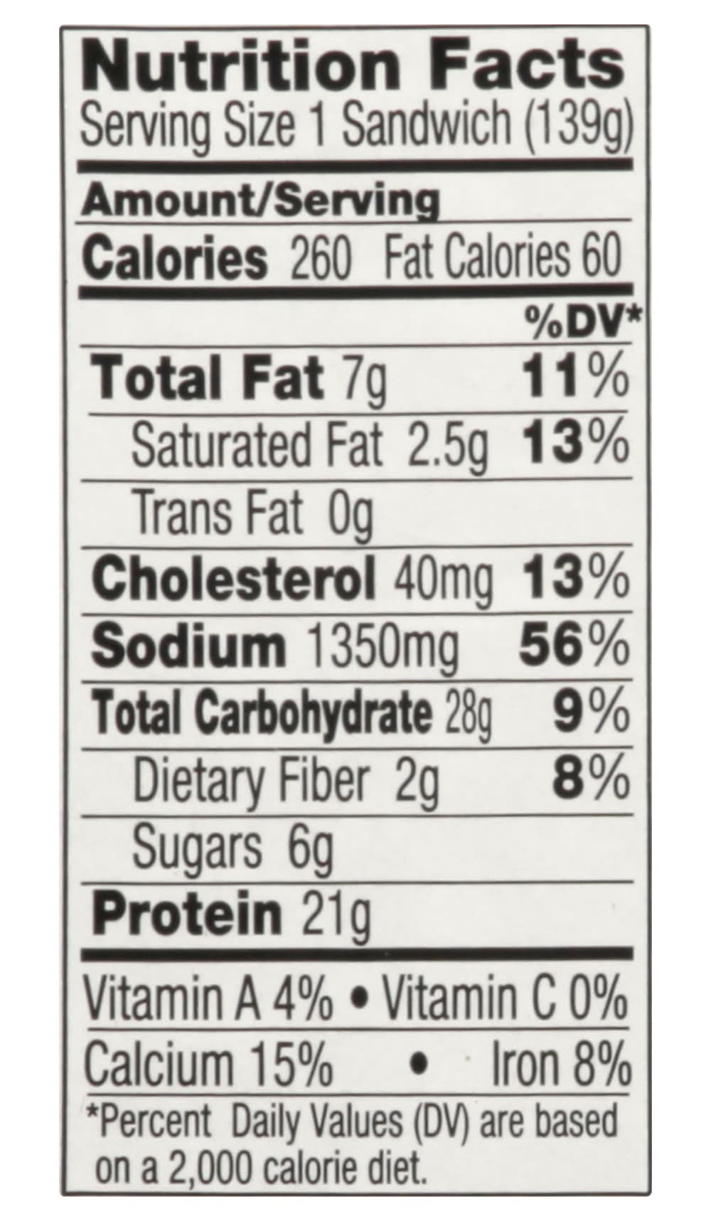 Ingredients: Smoked Ham - Water Added [a Portion of Ground Ham Shank and Ham Added (Cured with Water, Salt, Contains 2% or Less of Modified Food Starch, Corn Syrup, Dextrose, Potassium Lactate, Sodium Lactate, Sugar, Sodium Phosphates, Sodium Diacetate, Sodium Erythorbate, Sodium Nitrite)], White Bread [Unbleached Wheat Flour, Water, High Fructose Corn Syrup, Yeast, Liquid Soy Oil, Salt, Whey Solids, Yeast, Nutrients (Monocalcium Phosphate, Calcium Sulfate, Ammonium Sulfate, Potassium Iodate), Monoglycerides, Dough Conditioner (Sodium Stearoyl Lactylate, Calcium Peroxide), Mated Barley Flour, Calcium Propionate (to Retard Spoilage), Ferrous Sulfate (Iron), Niacin, Thiamine Hydrochloride (Vitamin B1), Riboflavin (Vitamin B2), Folic Acid], Pasteurized Process American Cheese [American Cheese (Pasteurized Milk, Cheese Cultures, Salt, Enzymes), Water, Cream, Sodium Phosphate (Emulsifier), Sorbic Acid (Preservative), Artificial Color] Contains: Wheat, Soybeans, Milk