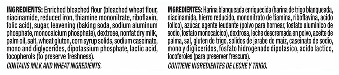 Ingredients: Enriched Bleached Flour (Bleached Wheat Flour, Niacinamide, Reduced Iron, Thiamine Mononitrate, Riboflavin, Folic Acid), Sugar, Leavening (Baking Soda, Sodium Aluminum Phosphate, Monocalcium Phosphate), Dextrose, Nonfat Dry Milk, Palm Oil, Salt, Wheat Gluten, Corn Syrup Solids, Sodium Caseinate, Mono and Diglycerides, Dipotassium Phosphate, Lactic Acid, Tocopherols (to Preserve Freshness) Contains: Milk, Wheat, Gluten