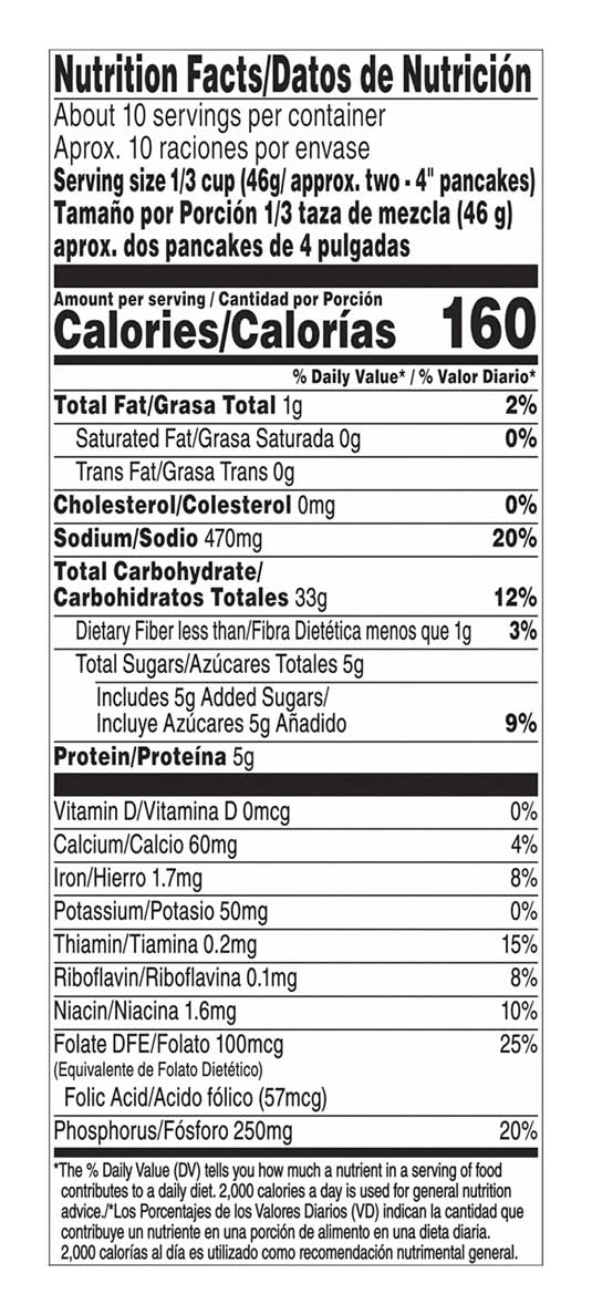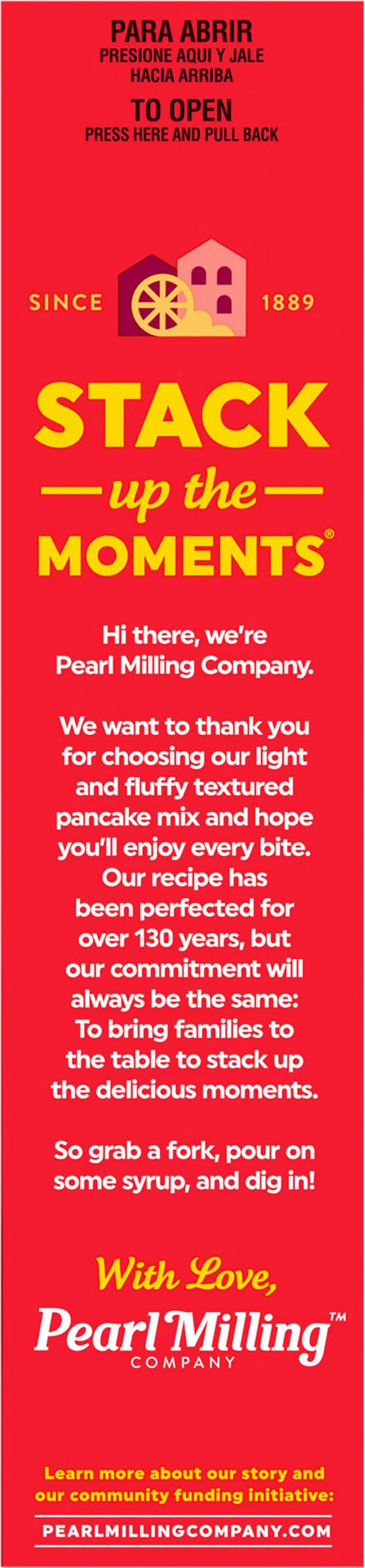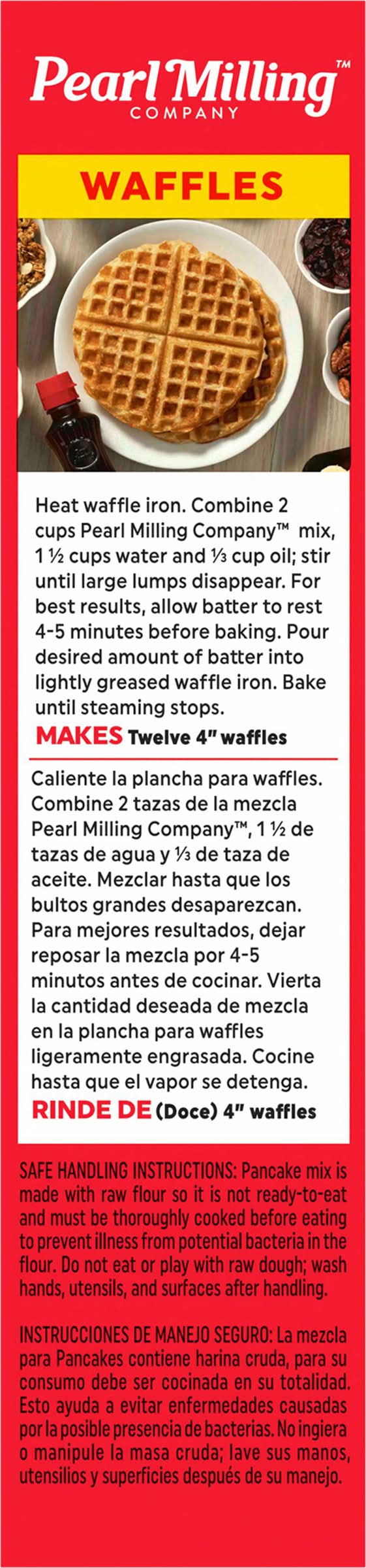 Pancakes: makes 6 four-inch pancakes: 1 cup dry mix; 3/4 cup water. 1. heat skillet over medium-low heat or electric griddle to 375 degrees f. 2. combine all ingredients and stir until large lumps disappear (do not beat or over-mix). let stand 1-2 minutes to thicken. 3. pour slightly less than 1/4 cup batter for each pancake onto lightly greased skillet. tip: for golden brown pancakes, use solid shortening instead of oil, butter, or margarine. 4. cook for 90 seconds on first side. turn, and cook for another 60 seconds. tip: for soft and fluffy pancakes, avoid turning them more than once. heat waffle iron. combine 2 cups pearl milling company mix, 1 1/2 cups water and 1/3 cup oil; stir until large lumps disappear. for best results, allow batter to rest 4-5 minutes before baking. pour desired amount of batter into lightly greased waffle iron. bake until steaming stops. makes twelve 4 waffles. to open, press here and pull back.