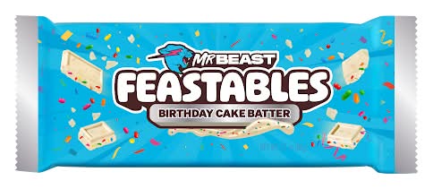Feastables Milk Chocolate and Birthday Batter Bar Display Feastables is on a mission to be a disruptor with a bold purpose in the Global Candy and Snacking Categories. • Brand: Feastables • Flavor: Birthday cake batter