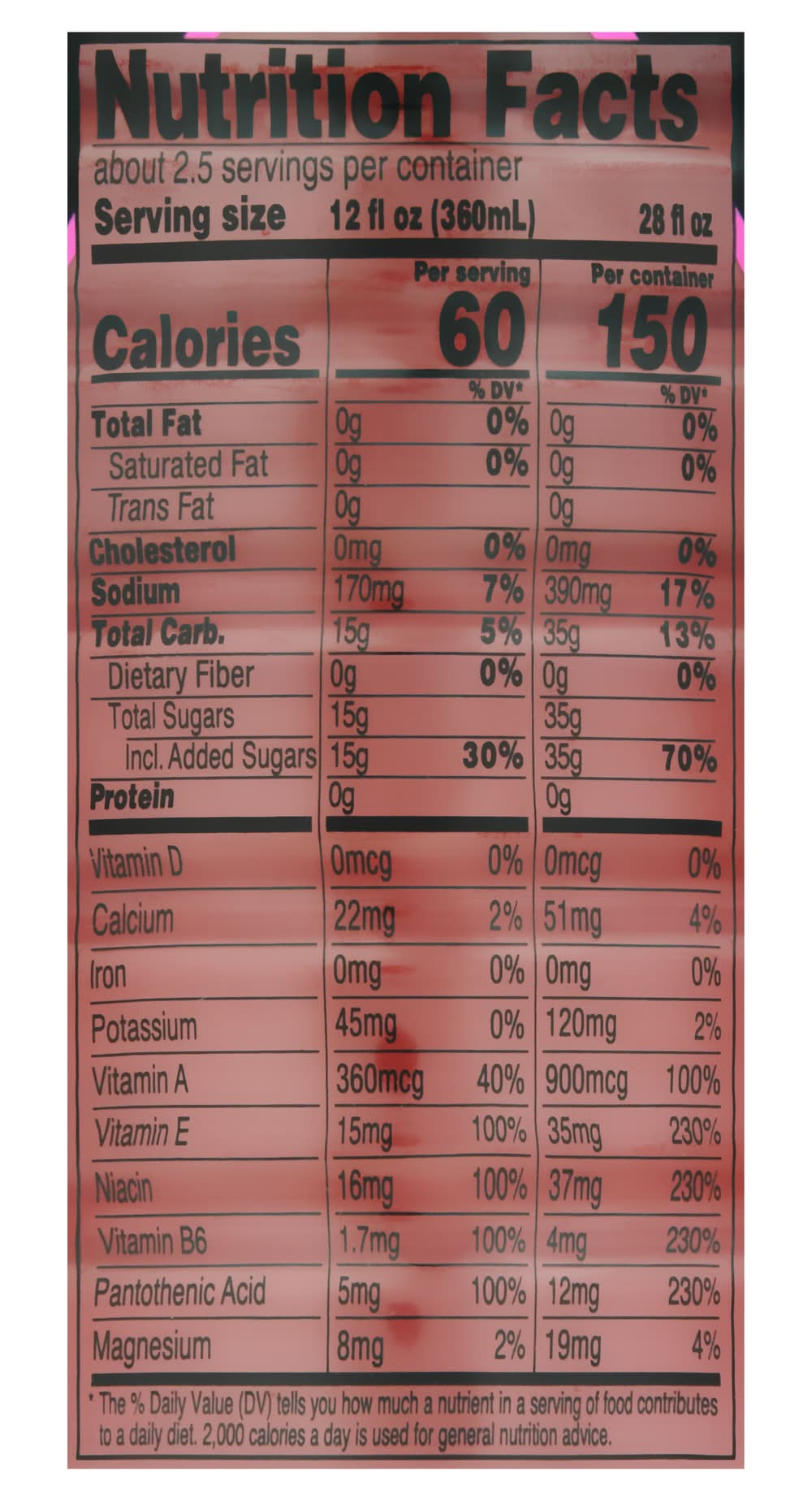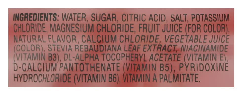 Ingredients: Water, Sugar, Citric Acid, Salt, Potassium Chloride, Magnesium Chloride, Fruit Juice (for Color), Natural Flavor, Calcium Chloride, Vegetable Juice (Color) Stevia Rebaudiana Leaf Extract, Niacinamide (Vitamin B3), DL-Alpha Tocopheryl Acetate (Vitamin E), D-Calcium Pantothenate (Vitamin B5), Pyridoxine Hydrochloride (Vitamin B6), Vitamin A Palmitate