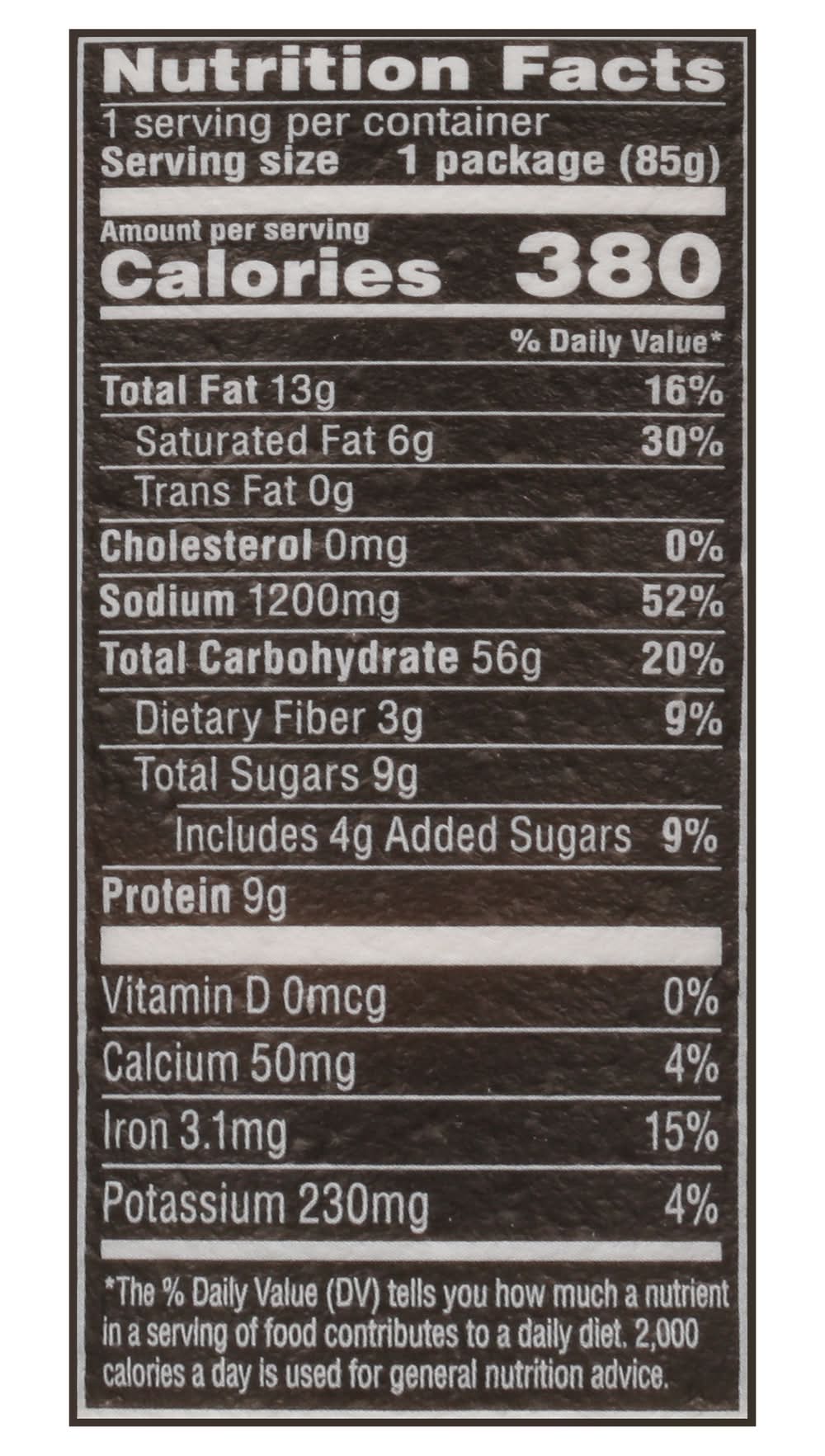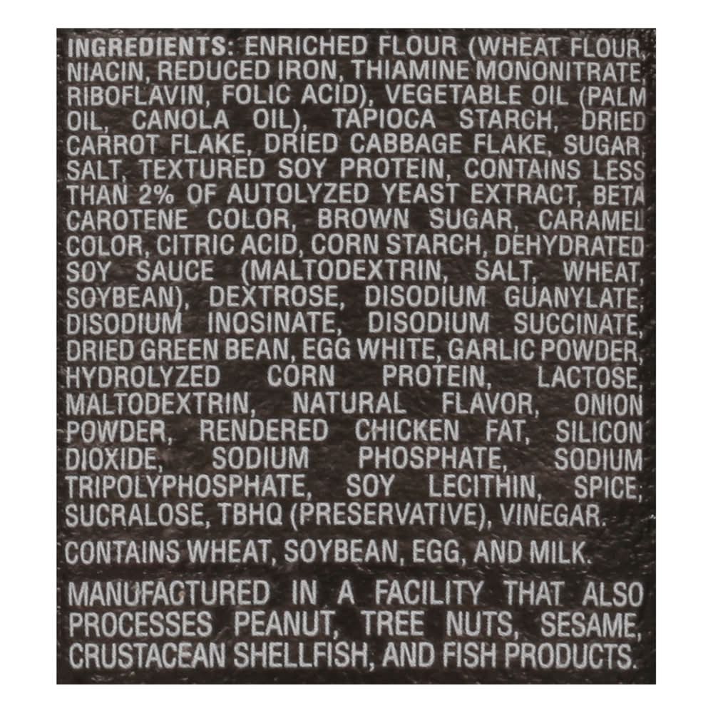 Ingredients: Enriched Flour (Wheat Flour, Niacin, Reduced Iron, Thiamine Mononitrate, Riboflavin, Folic Acid), Vegetable Oil (Palm Oil, Canola Oil), Tapioca Starch, Dried Carrot Flake, Dried Cabbage Flake, Sugar, Salt, Textured Soy Protein, Contains Less than 2% of Autolyzed Yeast Extract, Beta Carotene Color, Brown Sugar, Caramel Color, Citric Acid, Corn Starch, Dehydrated Soy Sauce (Maltodextrin, Salt, Wheat, Soybean), Dextrose, Disodium Guanylate, Disodium Inosinate, Disodium Succinate, Dried Green Bean, Egg White, Garlic Powder, Hydrolyzed Corn Protein, Lactose, Maltodextrin, Natural Flavor, Onion Powder, Rendered Chicken Fat, Silicon Dioxide, Sodium Phosphate, Sodium Tripolyphosphate, Soy Lecithin, Spice, Sucralose, TBHQ (Preservative), Vinegar Contains: Wheat, Soybeans, Corn, Eggs, Lactose, Peanuts, Tree Nuts, Sesame, Crustacean Shellfish, Fish