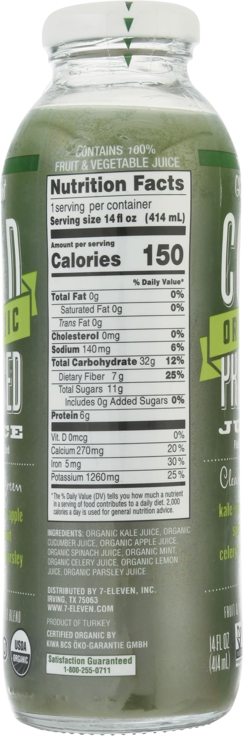 100% Fruit & vegetable juice blend. See nutrition panel for sugar and calorie content. USDA Organic. Certified Organic by Kiwa BCS Oko-Garantie GMBH. No sugar added. Not a low calorie food. See nutrition panel for sugar and calorie content. Non GMO Project Verified. nongmoproject.org. Go! Smart. Flash pasteurized. Clean & green. Kale, cucumber, apple, spinach, mint, celery, lemon, parsley. Not from concentrate. Satisfaction guaranteed: 1-800-255-0711. nongmoproject.org. www.7-eleven.com. 7rewards.com. Free food & drinks! 7Rewards - Join in the 7-Eleven App or at 7rewards.com. Certified Fair Trade FairTSA.org. Product of Turkey. • Brand: 7-select • kosher, vegan, gluten-free, organic, GMO-free