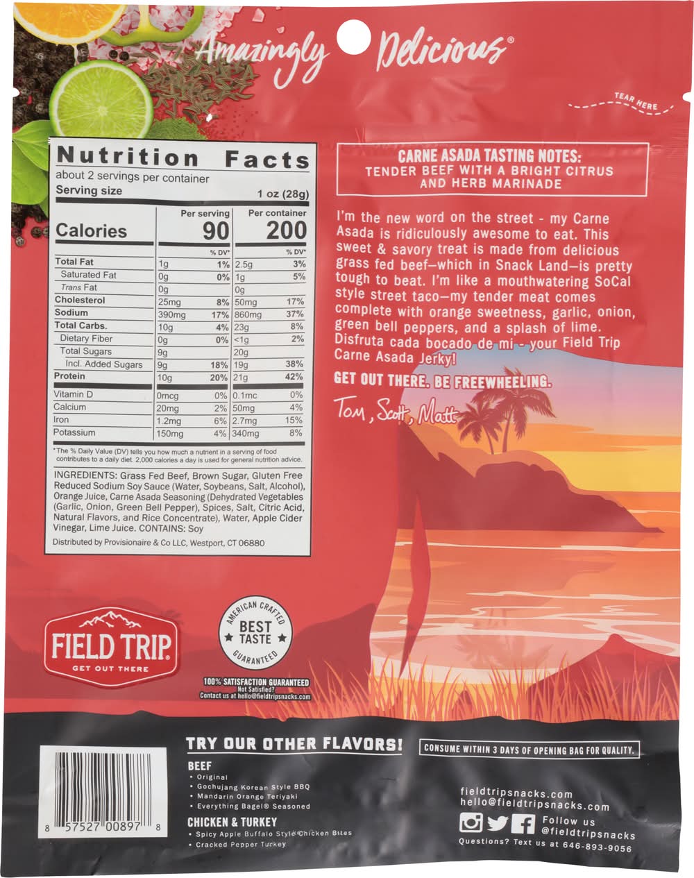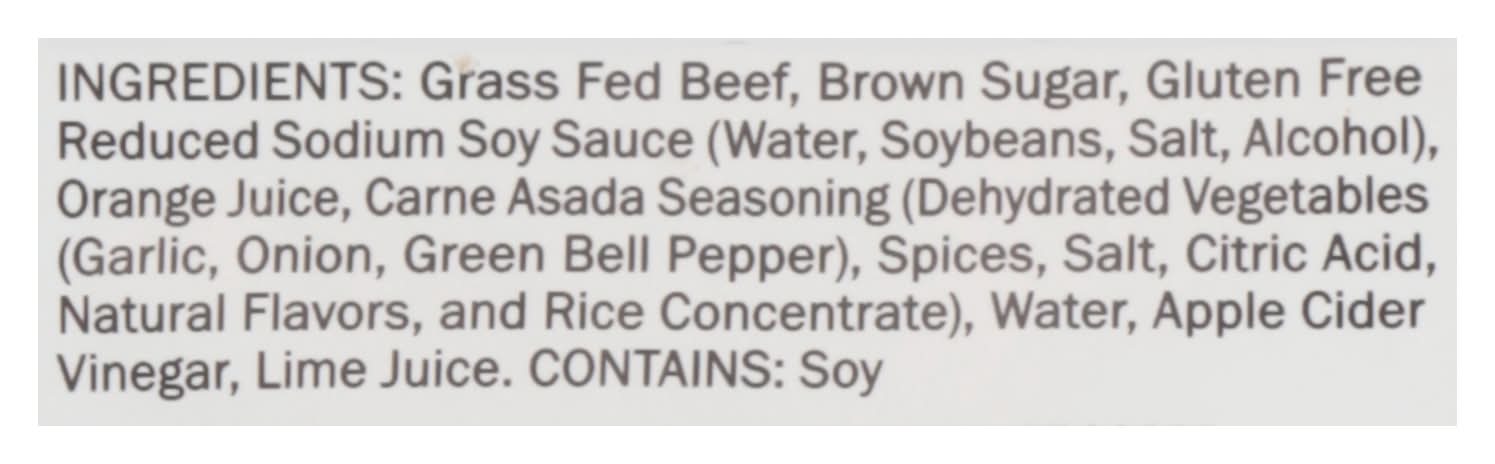 Ingredients: Grass Fed Beef, Brown Sugar, Gluten Free Reduced Sodium Soy Sauce (Water, Soybeans, Salt, Alcohol), Orange Juice, Carne Asada Seasoning (Dehydrated Vegetables (Garlic, Onion, Green Bell Pepper), Spices, Salt, Citric Acid, Natural Flavors, and Rice Concentrate), Water, Apple Cider Vinegar, Lime Juice Contains: Soybeans