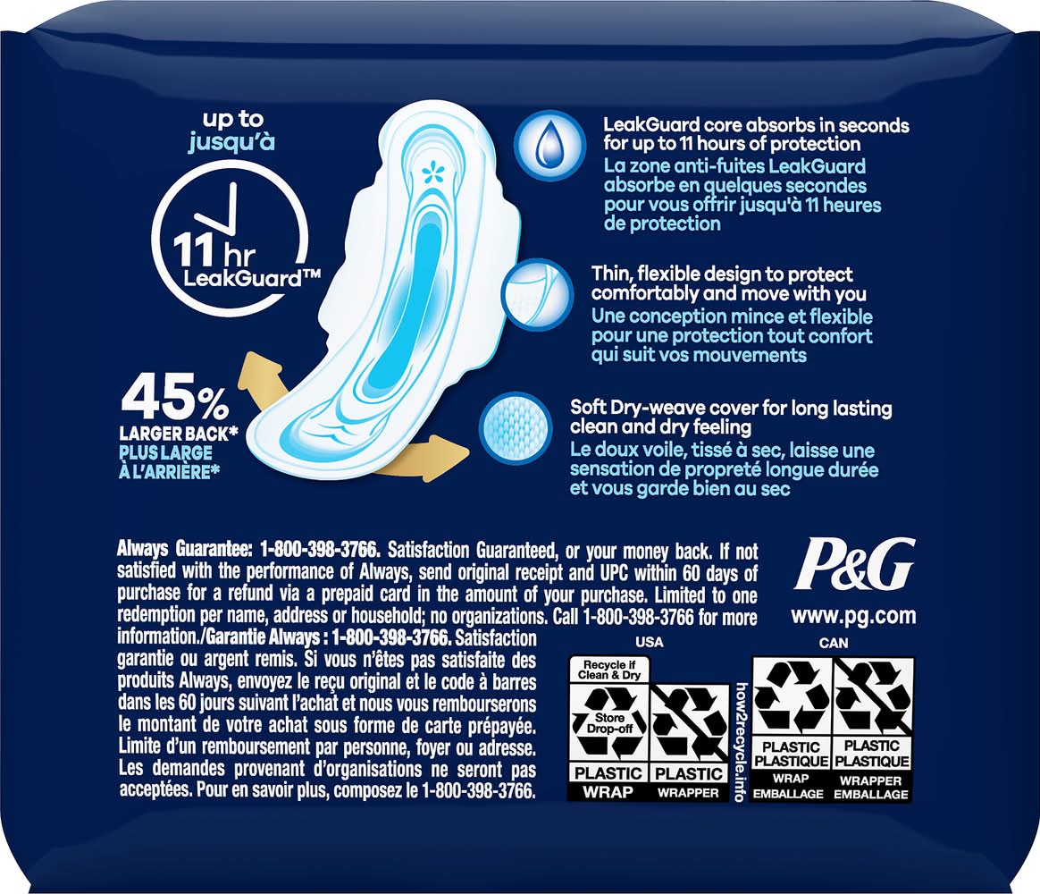 Up to 100% leak-free comfort. 45% larger back (vs. Always ultra thin regular with wings). Up to 11 hr LeakGuard. For fewer leaks step up in size. Great for day. Great for night. Panty Size: XS, S; 1. Panty Size: M, L; 2. Panty Size: XL+; 3. Panty Size: XS, S, M; 4. Panty Size: L, XL+; 5. LeakGuard core absorbs in seconds for up to 11 hours of protection. Thin, flexible design to protect comfortably and move with you. Soft dry-weave cover for long lasting clean and dry feeling. Brand: Always