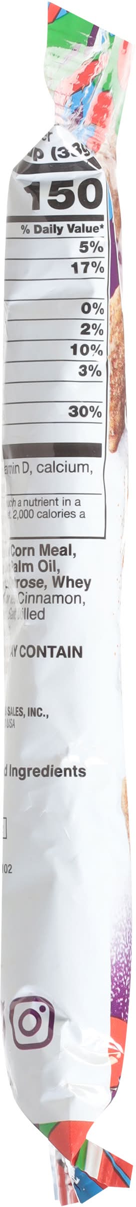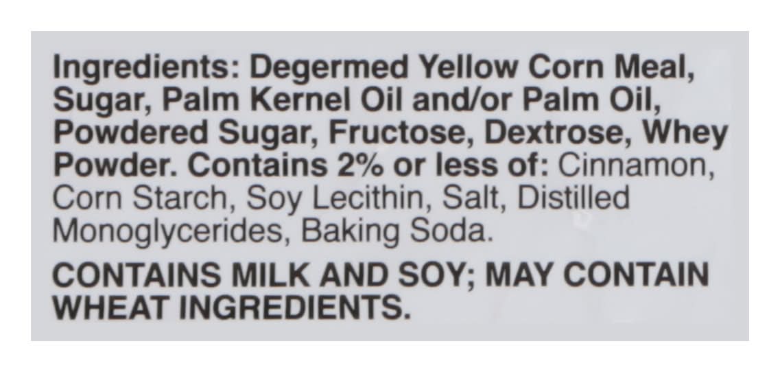 Ingredients: Degermed Yellow Corn Meal, Sugar, Palm Kernel Oil and/or Palm Oil, Powdered Sugar, Fructose, Dextrose, Whey Powder, Contains 2% or Less of: Cinnamon, Corn Starch, Soy Lecithin, Salt, Distilled Monoglycerides, Baking Soda Contains: Milk, Soybeans, Wheat