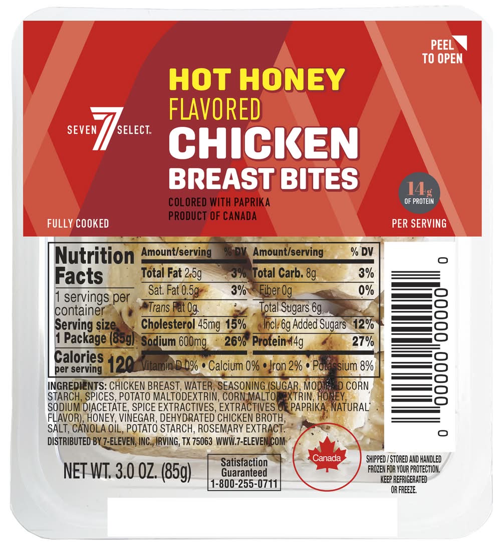 Enjoy our delicious, flame grilled not steamed fully cooked, 7 select hot honey flavored chicken breast bites. Ready to eat meal with 14g of protein per serving! Just heat up and ready to go! • Brand: 7-select • Flavor: Hot honey