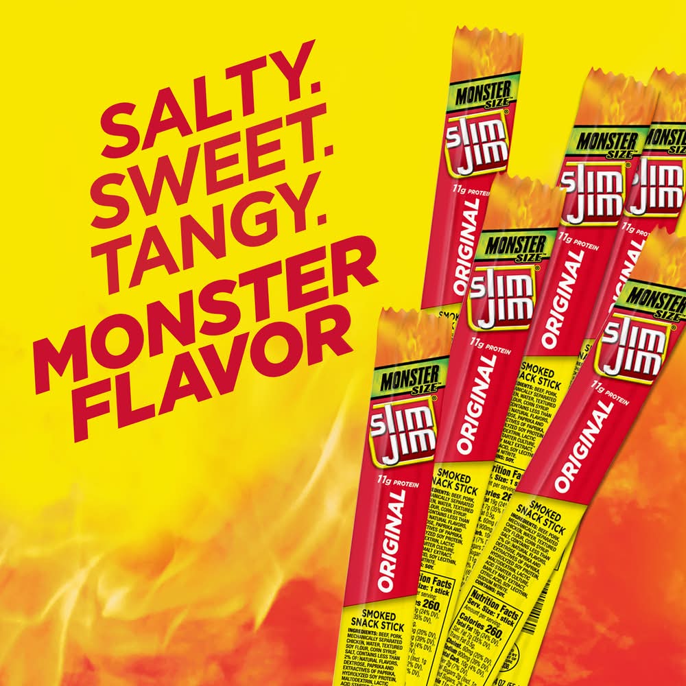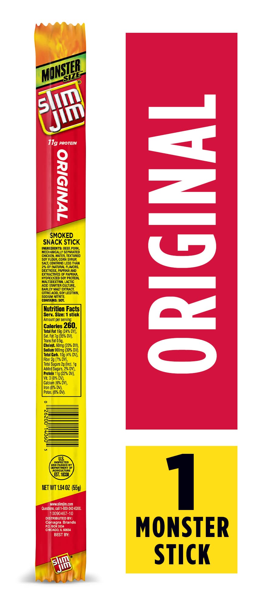 Experience intense, smoky flavor with delicious Slim Jim Monster Size Original Meat Sticks. Made with spicy beef, pork and chicken, these meat sticks contain no artificial flavors or colors for full meaty flavor everyone can love. Each meat stick serving is loaded with 11 grams of protein, ideal for protein snacks that kick hunger to the curb and leave you feeling satisfied. These individually wrapped snacks go where you go and are perfect as travel snacks, school snacks or anywhere meat snacks. Slim Jim Monster Size Original Meat Sticks offer a bold and tasty way to take on the day. Each snack stick is perfect for individual snacks, so you are ready to hit back when savory cravings hit. Slim Jim keeps it interesting with a full line of beef sticks, snack sticks, pork rinds and jerky. Snap into a Slim Jim • Brand: Slim jim • Flavor: Original