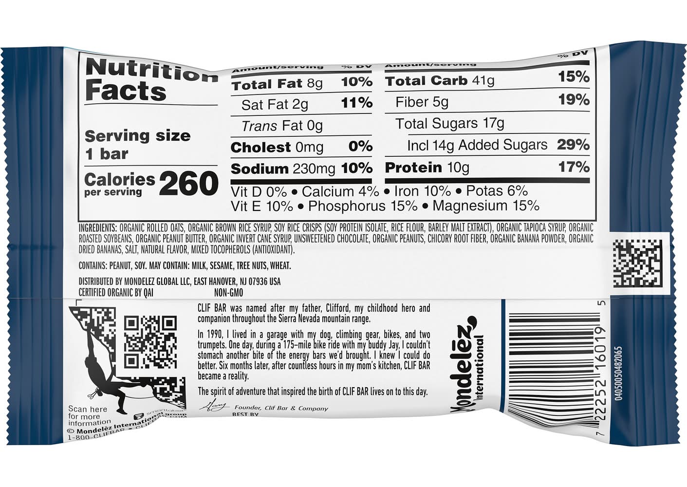 Born on a 175-mile bike ride, CLIF BAR energy bars are purposefully crafted with a mix of protein, fat, and carbohydrates to help sustain active bodies before and during long-lasting activity. CLIF BAR energy bars are made with quality ingredients like wholesome organic rolled oats and no high-fructose corn syrup, and they are non-GMO and plant-based for a granola bar you can feel good about. As part of the CLIF brand mission, our 2 LEED certified bakeries and Emeryville, CA office run with the help of on-site solar arrays and/or offset electricity through the purchase of renewable energy credits (RECs). From CLIF BAR Energy Bars to Builders Protein Bars and Zbar Snack Bars, our brands turn grabbing a bar into raising your bar. • Brand: Clif bar • Flavor: Peanut butter banana • organic