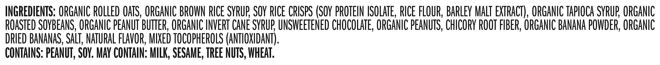 Ingredients: INGREDIENTS: ORGANIC ROLLED OATS, ORGANIC BROWN RICE SYRUP, SOY RICE CRISPS (SOY PROTEIN ISOLATE, RICE FLOUR, BARLEY MALT EXTRACT), ORGANIC TAPIOCA SYRUP, ORGANIC ROASTED SOYBEANS, ORGANIC PEANUT BUTTER, ORGANIC INVERT CANE SYRUP, UNSWEETENED CHOCOLATE, ORGANIC PEANUTS, CHICORY ROOT FIBER, ORGANIC BANANA POWDER, ORGANIC DRIED BANANAS, SALT, NATURAL FLAVOR, MIXED TOCOPHEROLS (ANTIOXIDANT), . CONTAINS: PEANUT, SOY. MAY CONTAIN: MILK, SESAME, TREE NUTS, WHEAT. Contains: CONTAINS: PEANUT, SOY.MAY CONTAIN: MILK, SESAME, TREE NUTS, WHEAT.