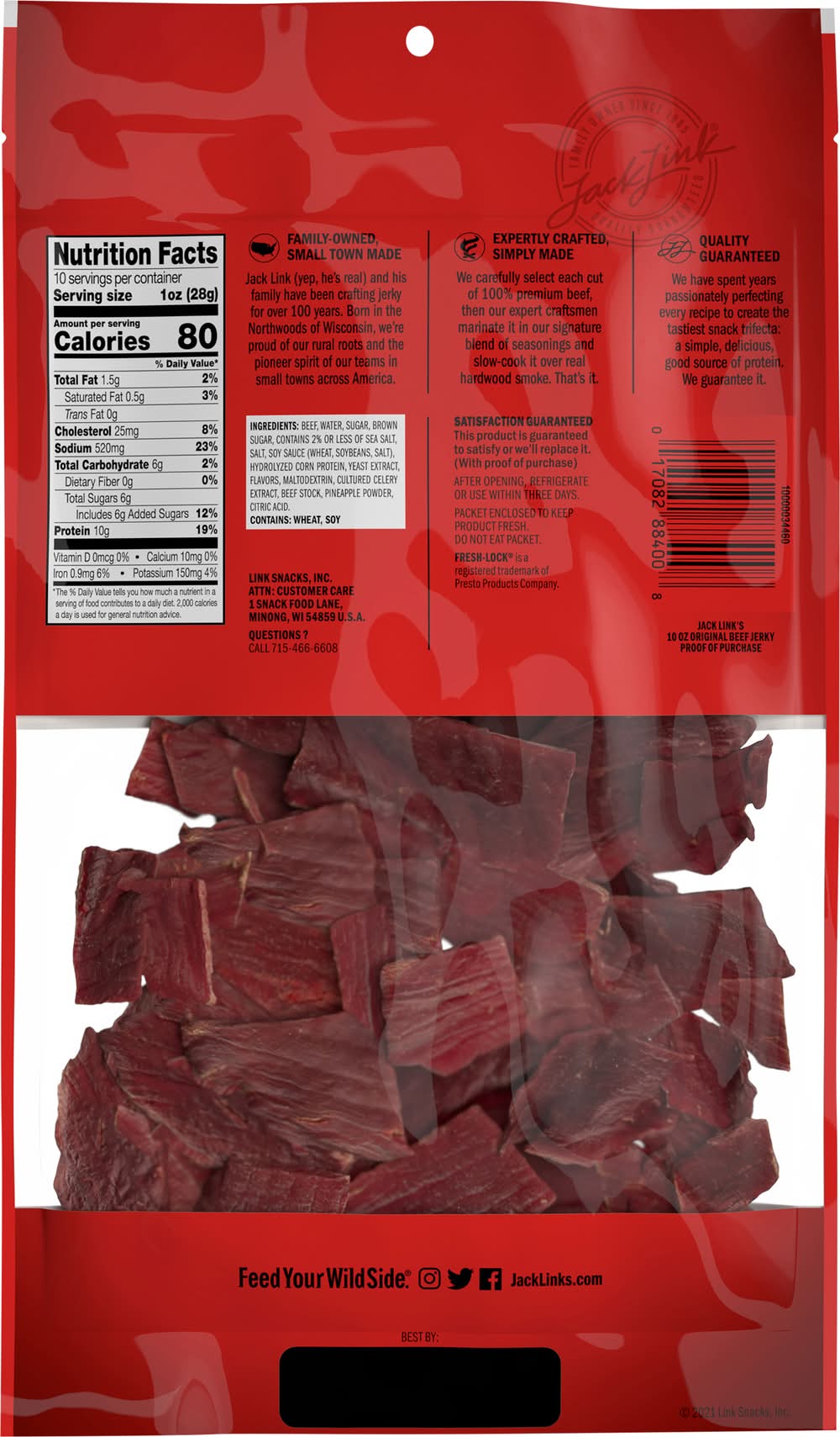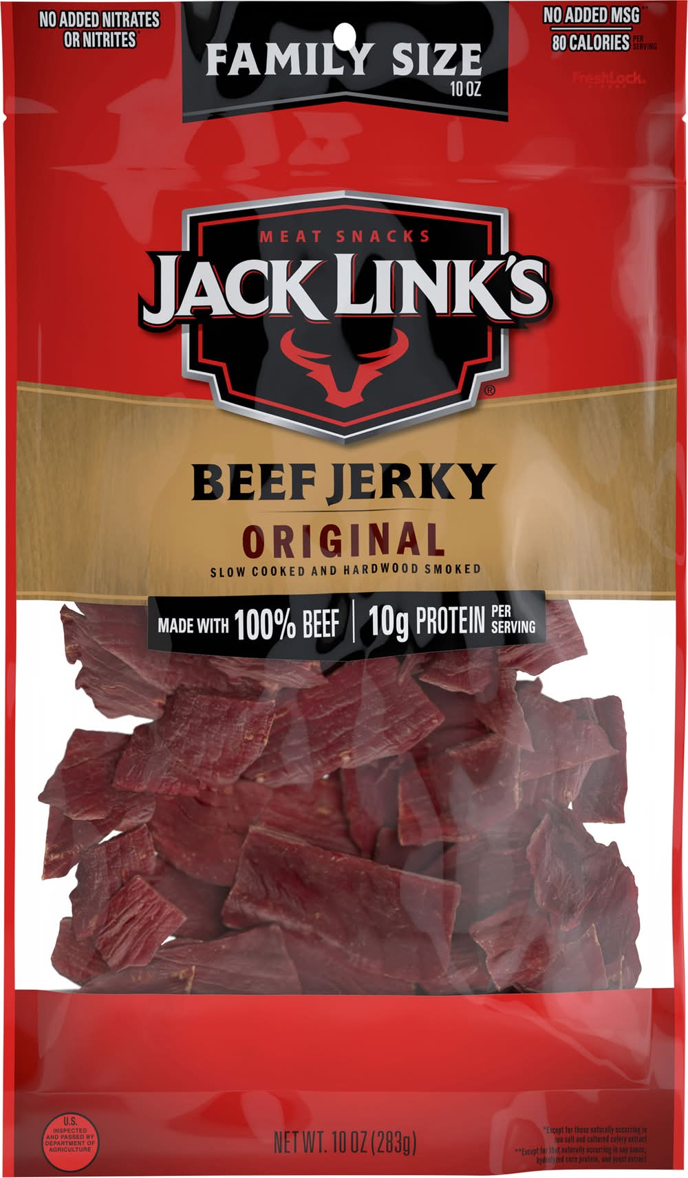 Slow cooked and hardwood smoked. Made with premium beef. US inspected and passed by Department of Agriculture. There's more than the best darn jerky in this bag - there's tradition. Born in the Northwoods of Wisconsin with nothing more than a passion for great tasting snacks, our company has been family-owned and operated for over 100 years. We're proud of our rural roots, and our pioneer spirit continues today through our team members who work in small towns across America. Our team sources the highest-quality meat, crafting and seasoning it ourselves to recreate the time-honored recipes that have been passed down by my family for generations. We hope you enjoy our delicious tradition that continues today. From all of us at Jack Link's, thank you for your patronage, and remember to Feed Your Wild Side! Feed Your Wild Side. Jack Link's Jerky is a nutritious snack and a good source of protein. • Brand: Jack link's • Number of servings: 10