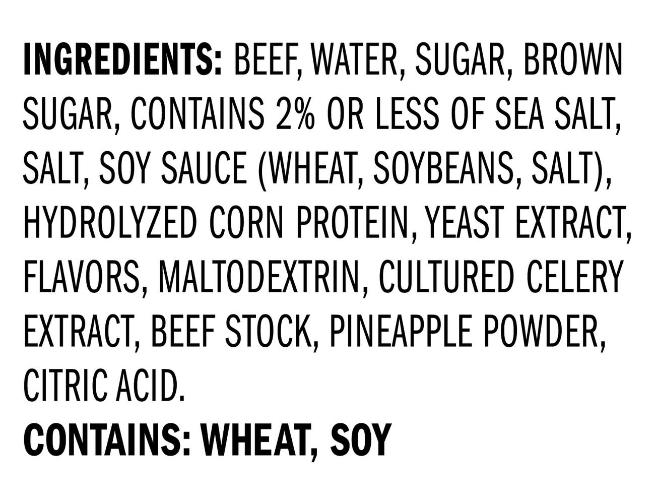 Ingredients: Beef, Water, Sugar, Brown Sugar, Contains 2% or Less of Sea Salt, Salt, Soy Sauce (Wheat, Soybeans, Salt), Hydrolyzed Corn Protein, Yeast Extract, Flavors, Maltodextrin, Cultured Celery Extract, Beef Stock, Pineapple Powder, Citric Acid Contains: Soybeans, Wheat