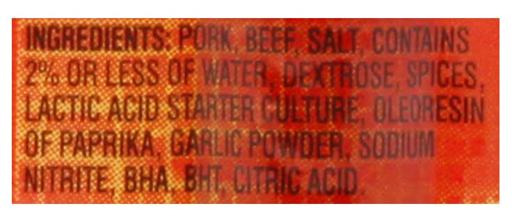 Ingredients: Pork, Salt, Contains 2% or Less of Water, Dextrose, Spices, Lactic Acid Started Culture, Oleoresin of Paprika, Garlic Powder, Sodium Nitrite, BHA, BHT, Citric Acid