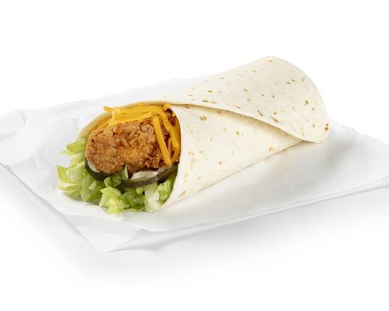 Crispy chicken strip, shredded cheddar cheese, shredded lettuce, pickles, and Mayo rolled up in a flour tortilla