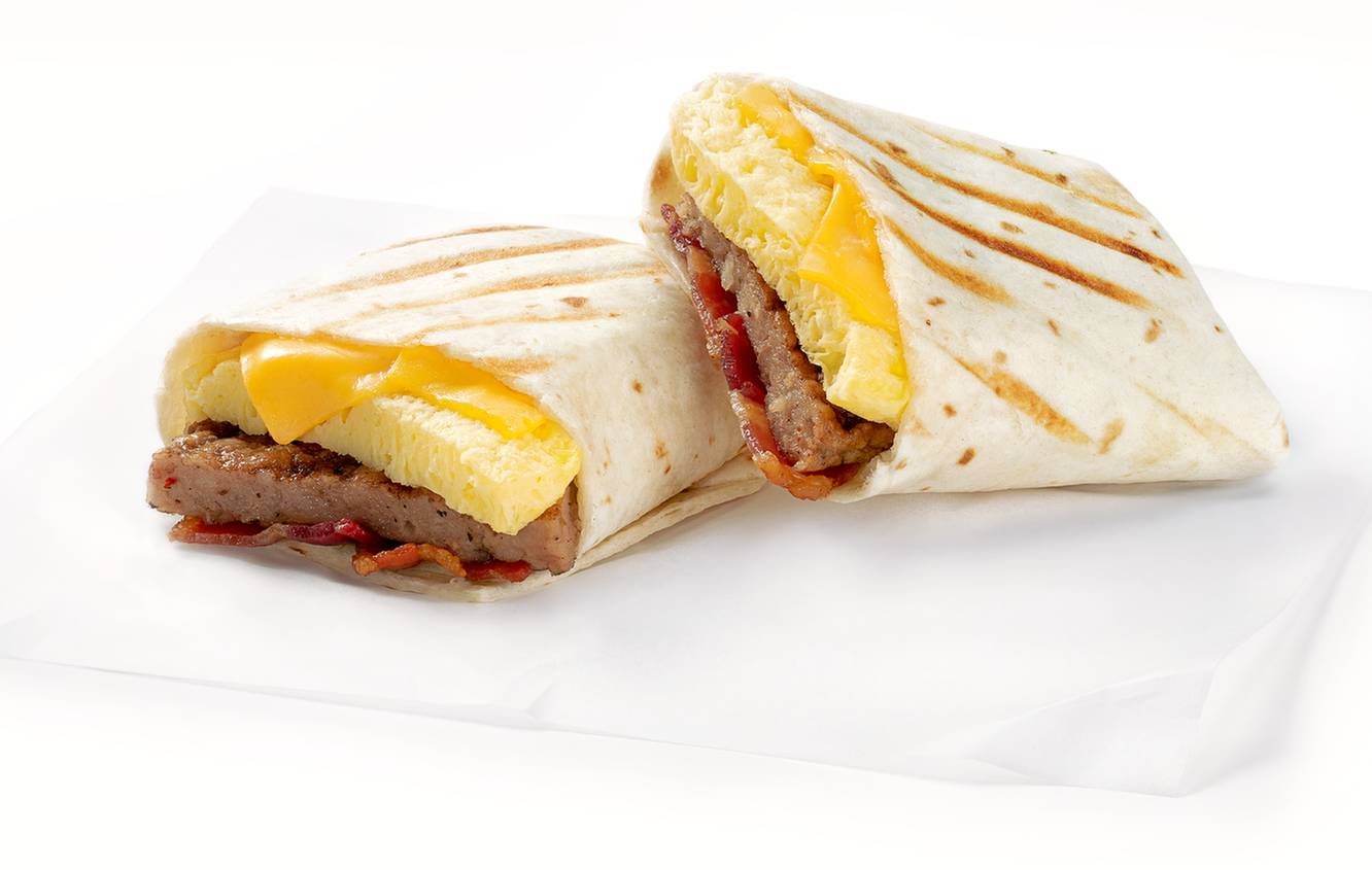 Crispy bacon, sausage, a scrambled egg patty, and American cheese wrapped in a flour tortilla. Grilled and pressed for the perfect hand held breakfast.