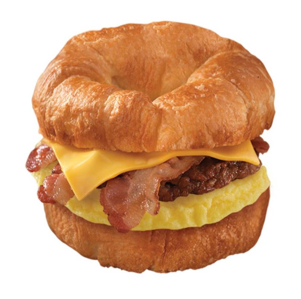 Crispy bacon, zesty sausage, scrambled egg patty, and American cheese inside a warm flaky croissant.