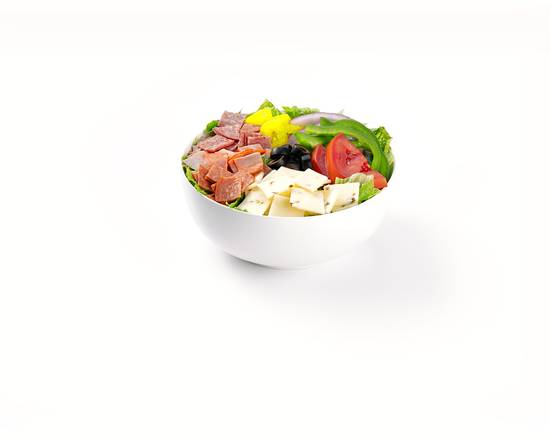 Chopped romaine topped with chopped capicola ham, salami, pepperoni, and pepperjack cheese. Tomato, banana peppers, green peppers, red onions and black olives.