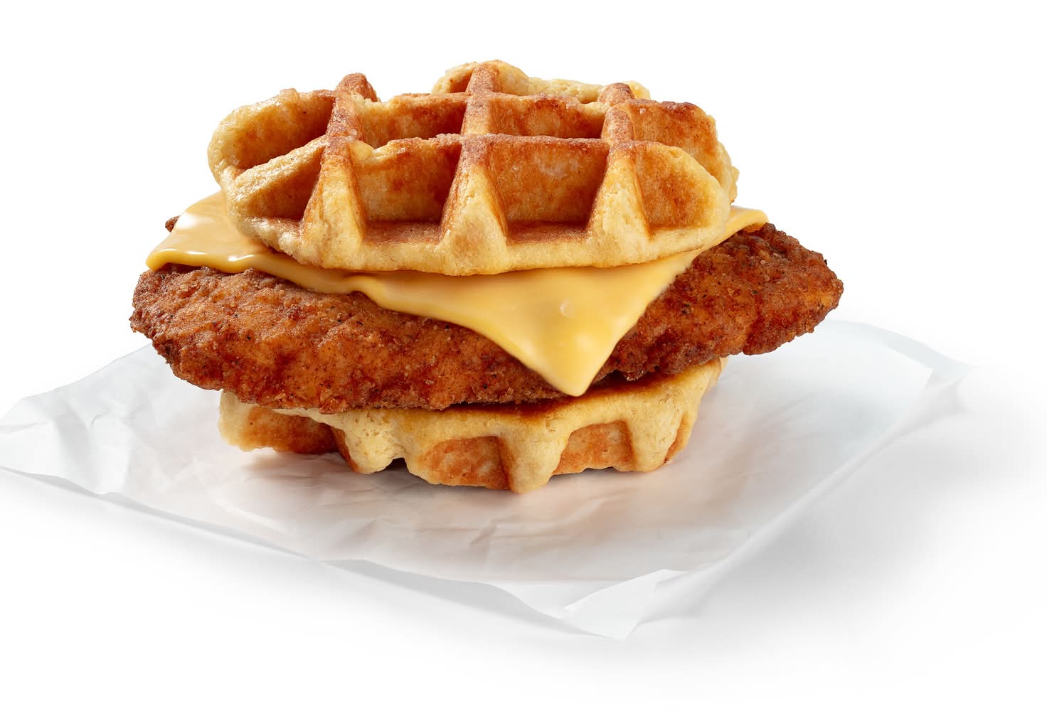 A breaded chicken patty and cheese, sandwiched between two waffles.