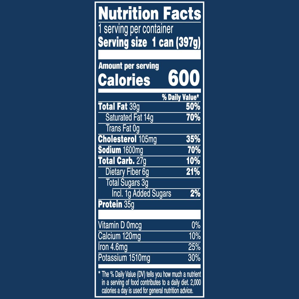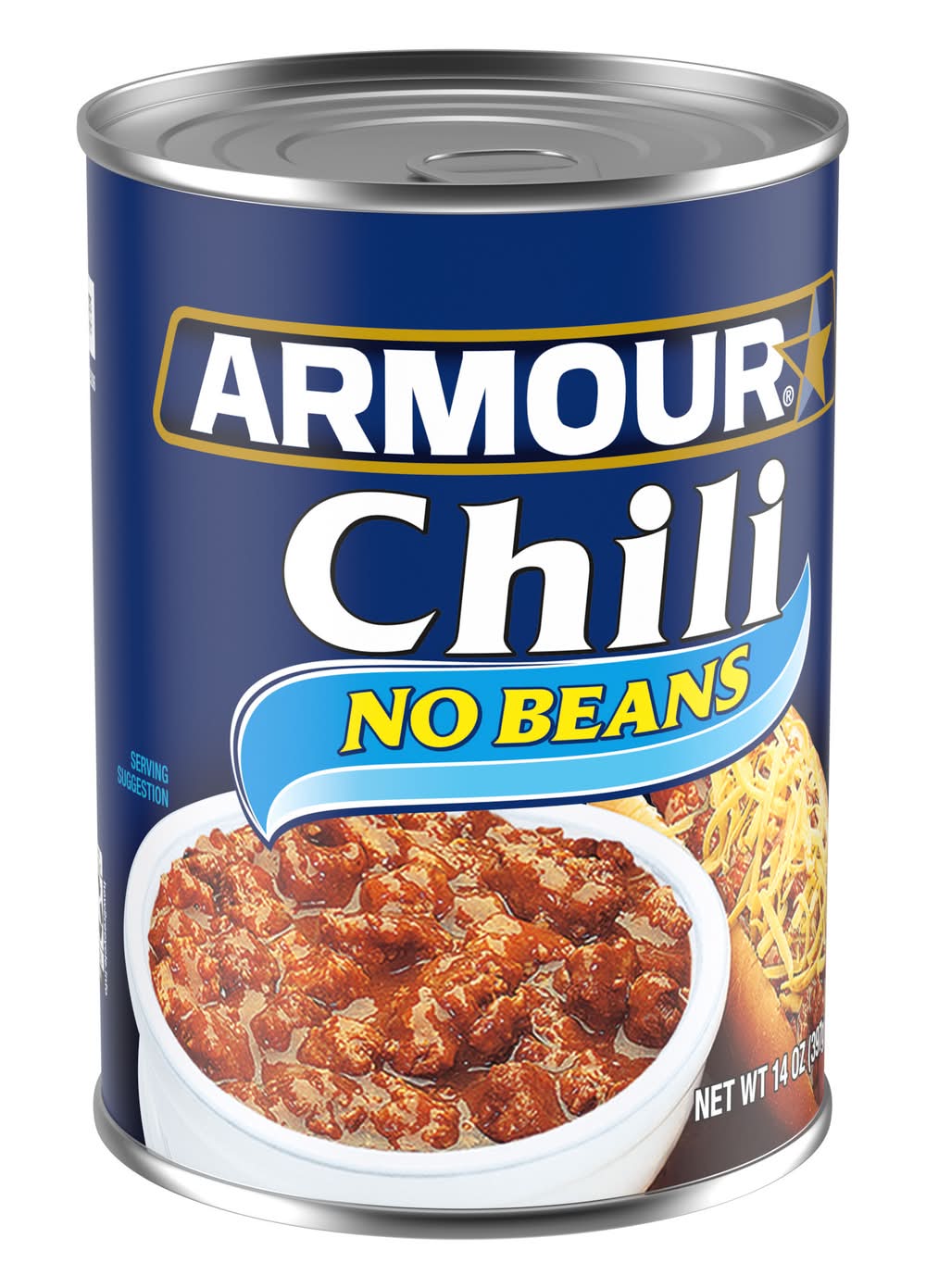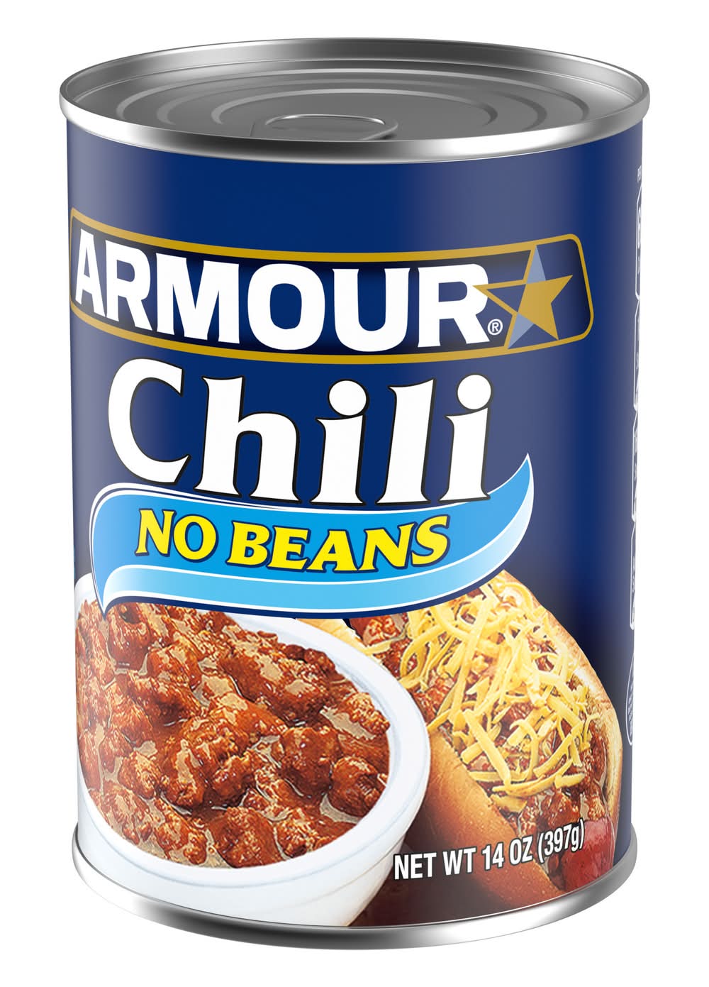 Armour Star No Bean Chili delivers a quick and easy canned food meal with great flavor. The canned meal offers a delicious chili recipe made with pork and beef without beans. This microwave chili is ideal for topping nachos, hot dogs, rice and more, or simply top it with grated cheese, chopped onions and sour cream for an easy meal. Heat the no bean chili on the stove top or in the microwave in 10 minutes or less. This can of chili is ideal for picnics, camping, road trips and more. Make any time Armour Star time. • Pinnacle Foods Group LLC, Cherry Hill, NJ, 08003-3620 • Packaging: Reusable