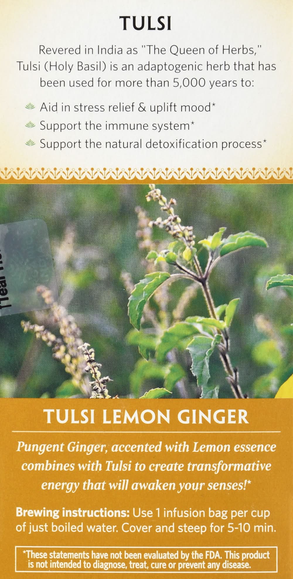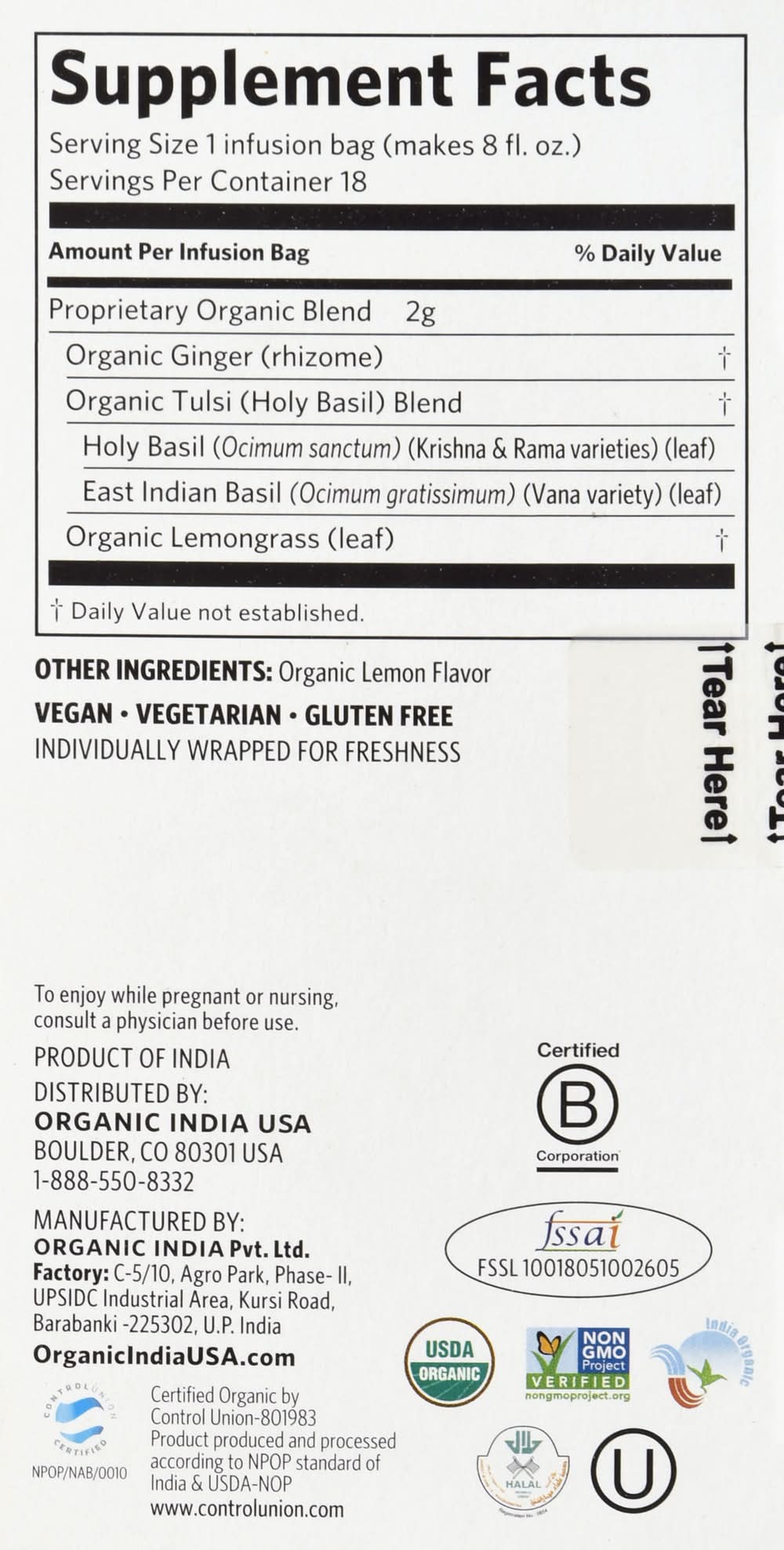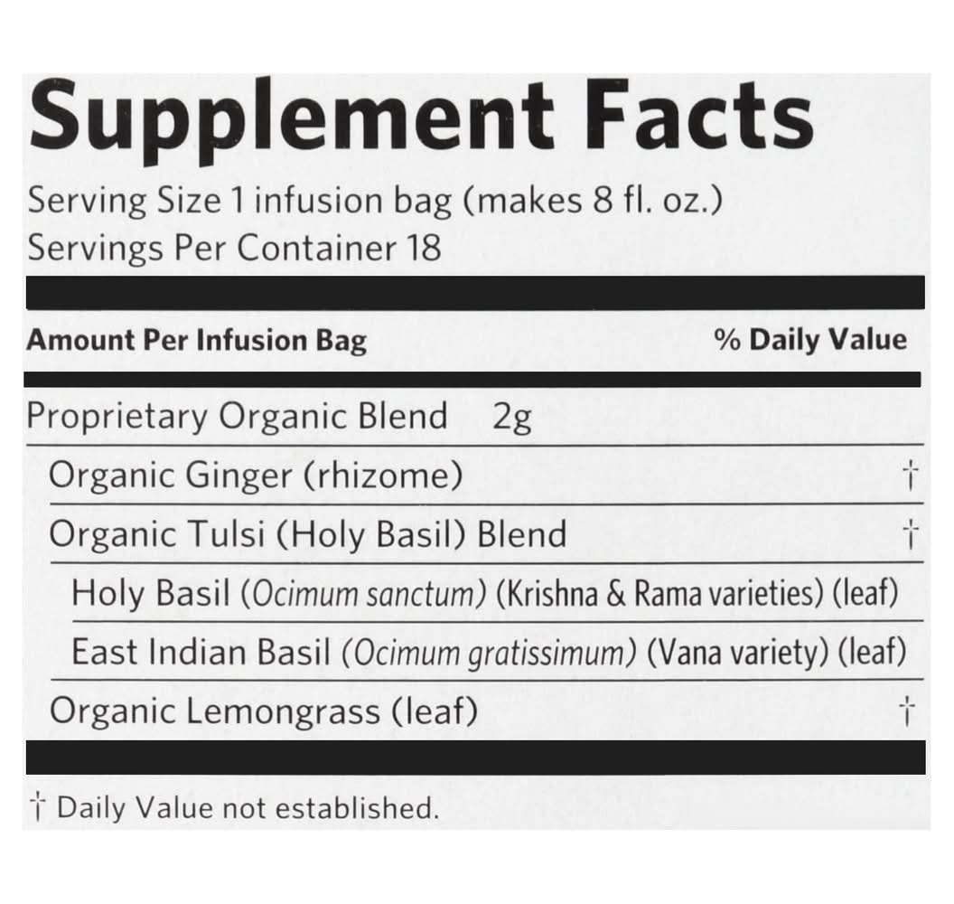 Ingredients: Proprietary Organic Blend: Organic Ginger (Rhizome), Organic Tulsi (Holy Basil) Blend, Holy Basil (Ocimum Sanctum) (Krishna & Rama Varieties) (Leaf), East India Basil (Ocimum Gratissimum) (Vana Variety) (Leaf), Organic Lemongrass (Leaf). Other Ingredients: Organic Lemon Flavor