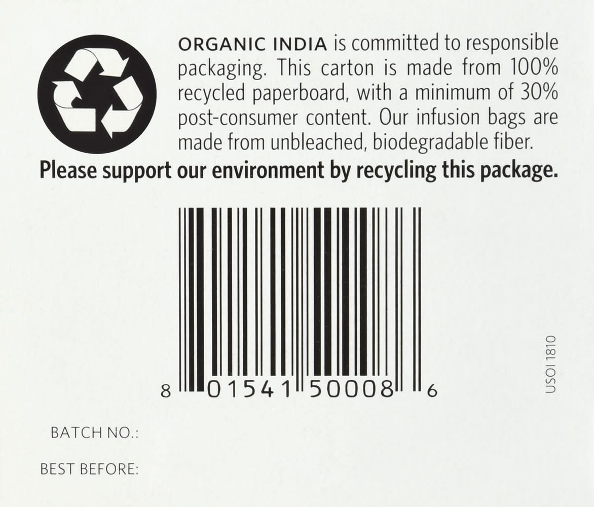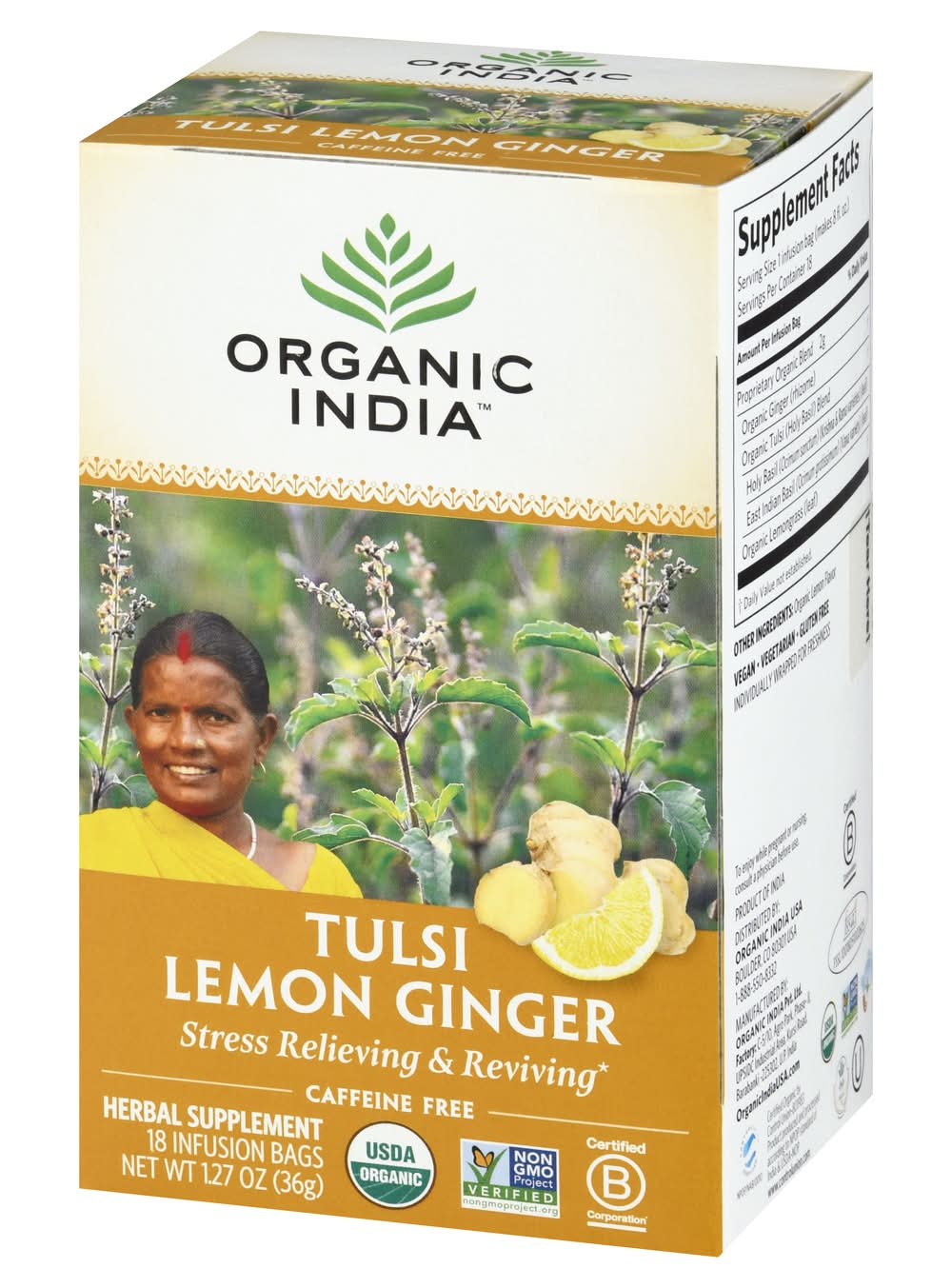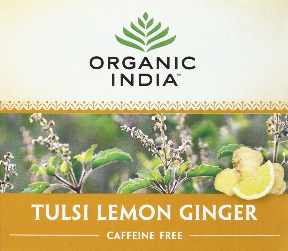 Ingredients: Proprietary Organic Blend: Organic Ginger (Rhizome), Organic Tulsi (Holy Basil) Blend, Holy Basil (Ocimum Sanctum) (Krishna & Rama Varieties) (Leaf), East India Basil (Ocimum Gratissimum) (Vana Variety) (Leaf), Organic Lemongrass (Leaf). Other Ingredients: Organic Lemon Flavor