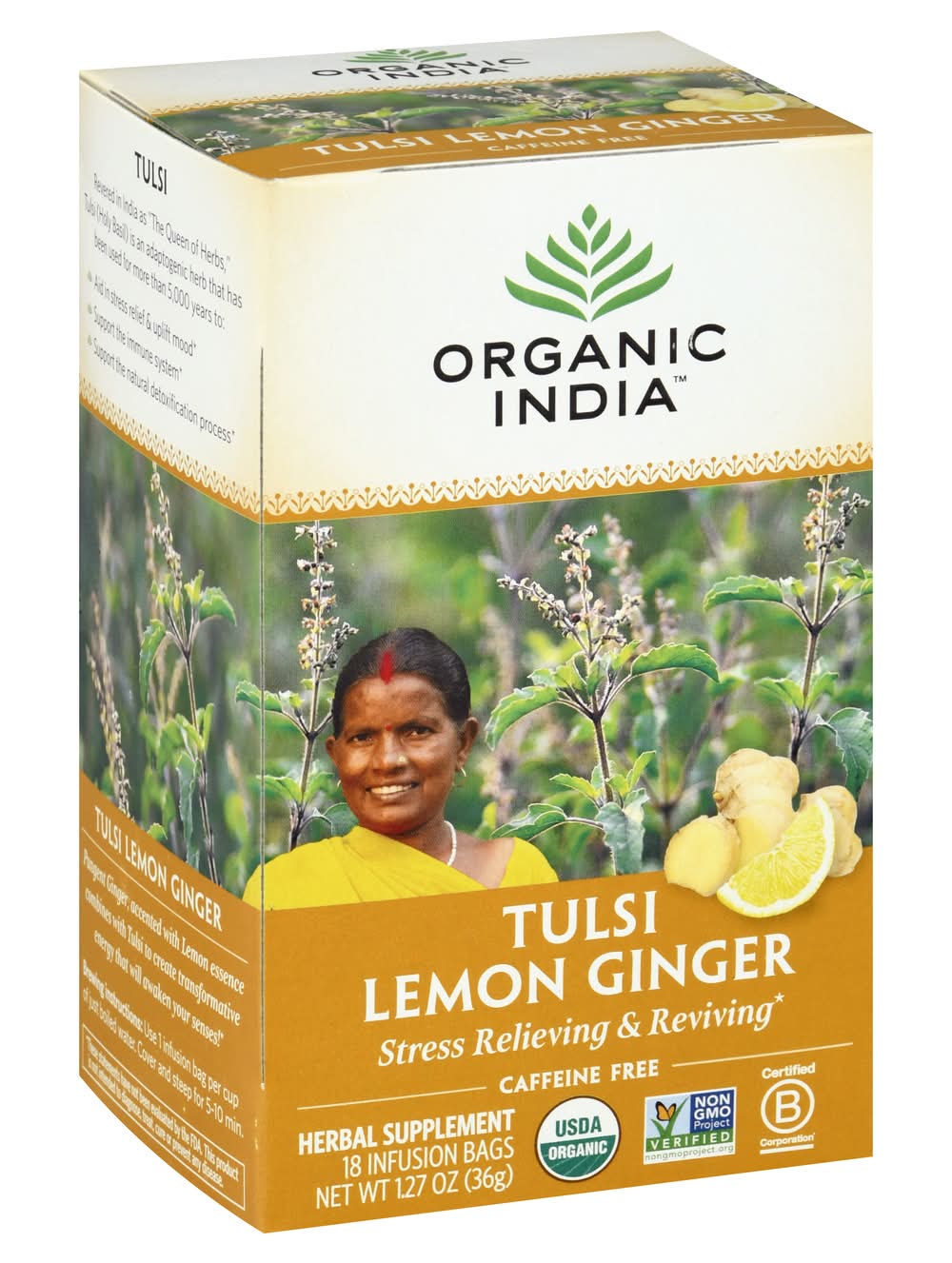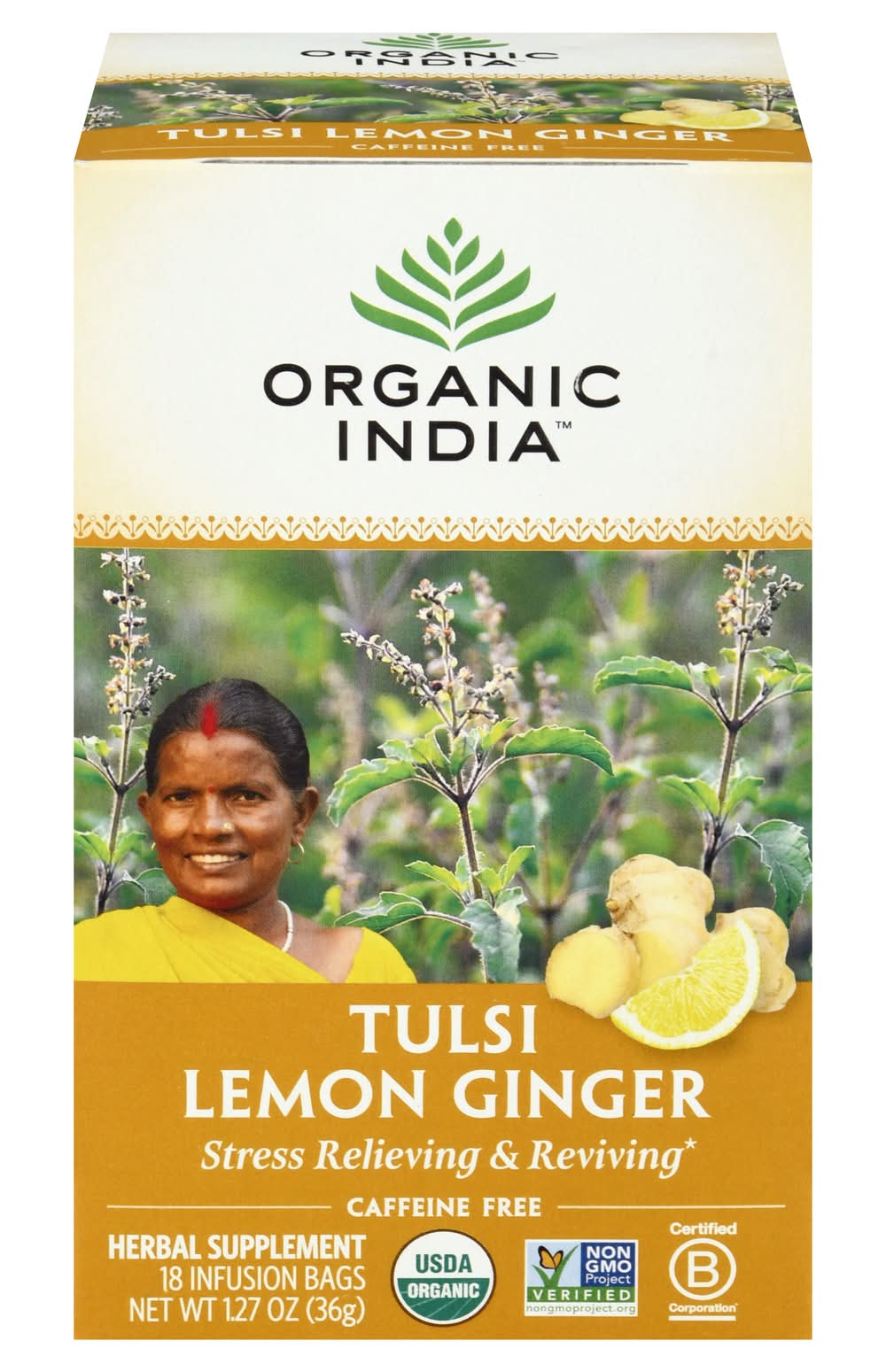Organic India Herbal Supplements Caffeine Cafe Tea Bags, Tulsi, Lemon, Ginger (1.27 oz, 18 ct)