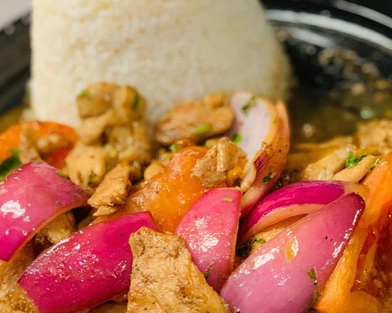 Pollo Saltado, or Peruvian Chicken Stir Fry, is a flavorful fusion cuisine with a mix of stir fry chicken, veggies, and potato fries. This dish offers spiced chicken, tomatoes, onions, a delicious vinegar based sauce, mixed with fries and served over rice.