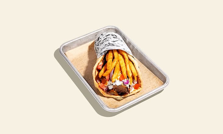 protein • zesty feta • berliner sauce • tzatziki • onion • tomato and french fries • all wrapped in a pillowy pita